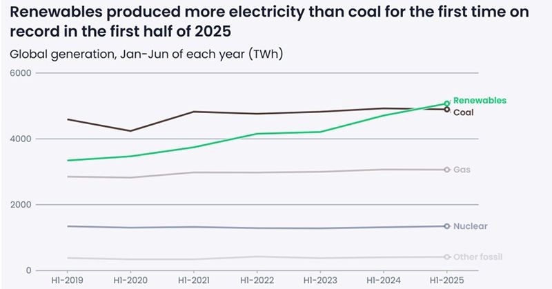 環境・エネルギー分野のシンクタンクである英Ember(エンバー)は10月7日、2025年上半期における世界の発電量に関する調査レポート「Global Electricity Mid-Year Insights 2025(2025年中期・世界電力展望)」を発表した。太陽光発電と風力発電の大幅な増加により、再生可能エネルギー発電が初めて石炭火力発電を上回った。 以下ソース