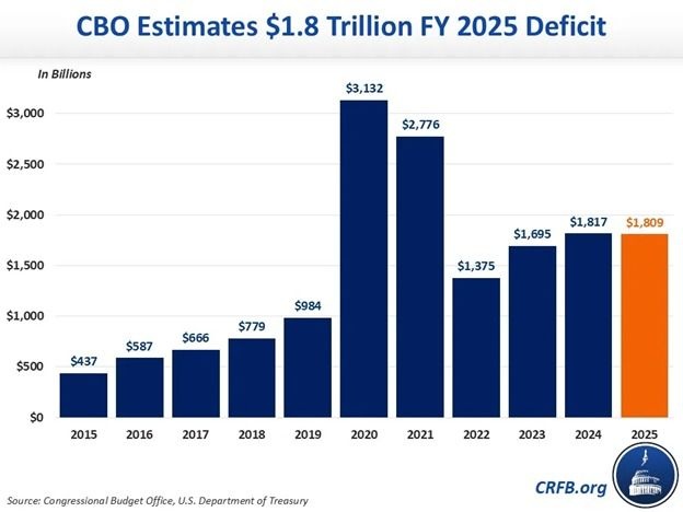 米国の議会予算局(CBO)の推計によると、2025会計年度の連邦赤字は1.8兆ドルに達しました。これは国内総生産(GDP)の6.0%に相当し、第二次世界大戦、2008年の金融危機、2020年のパンデミックを除けば過去最高水準の赤字です。今回の赤字は、パンデミック時の2020年(3.1兆ドル)および2021年(2.8兆ドル)に次ぐ過去4番目の規模となります。さらに、利払いだけで前年より800億ドル増加し、年間で初めて1兆ドルを突破しました。米国の債務問題は、新たな深刻な段階に達したと言えます。