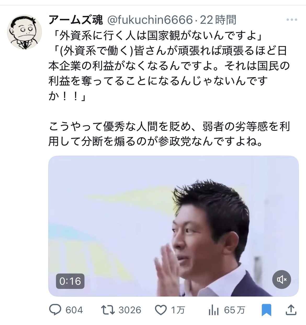 参政党代表神谷「外資系で働くな!外資系で頑張れば頑張るほど日本企業の利益が無くなる。外資系で働くことで国民の利益を奪ってる!」