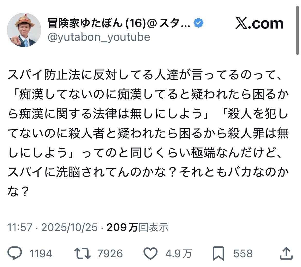 ゆたぼん、正論「スパイ防止法に反対してる人ってスパイに洗脳されてんのかな?それとも馬鹿なのかな?」