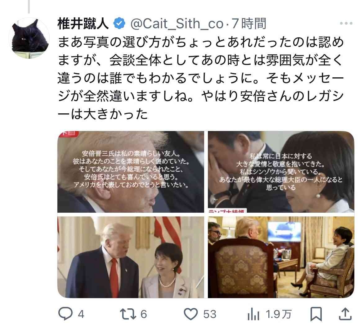会談全体として上げてる画像で安倍の話ばかりで高市の名前一切無いってのが存在感の無さの表れってこと?