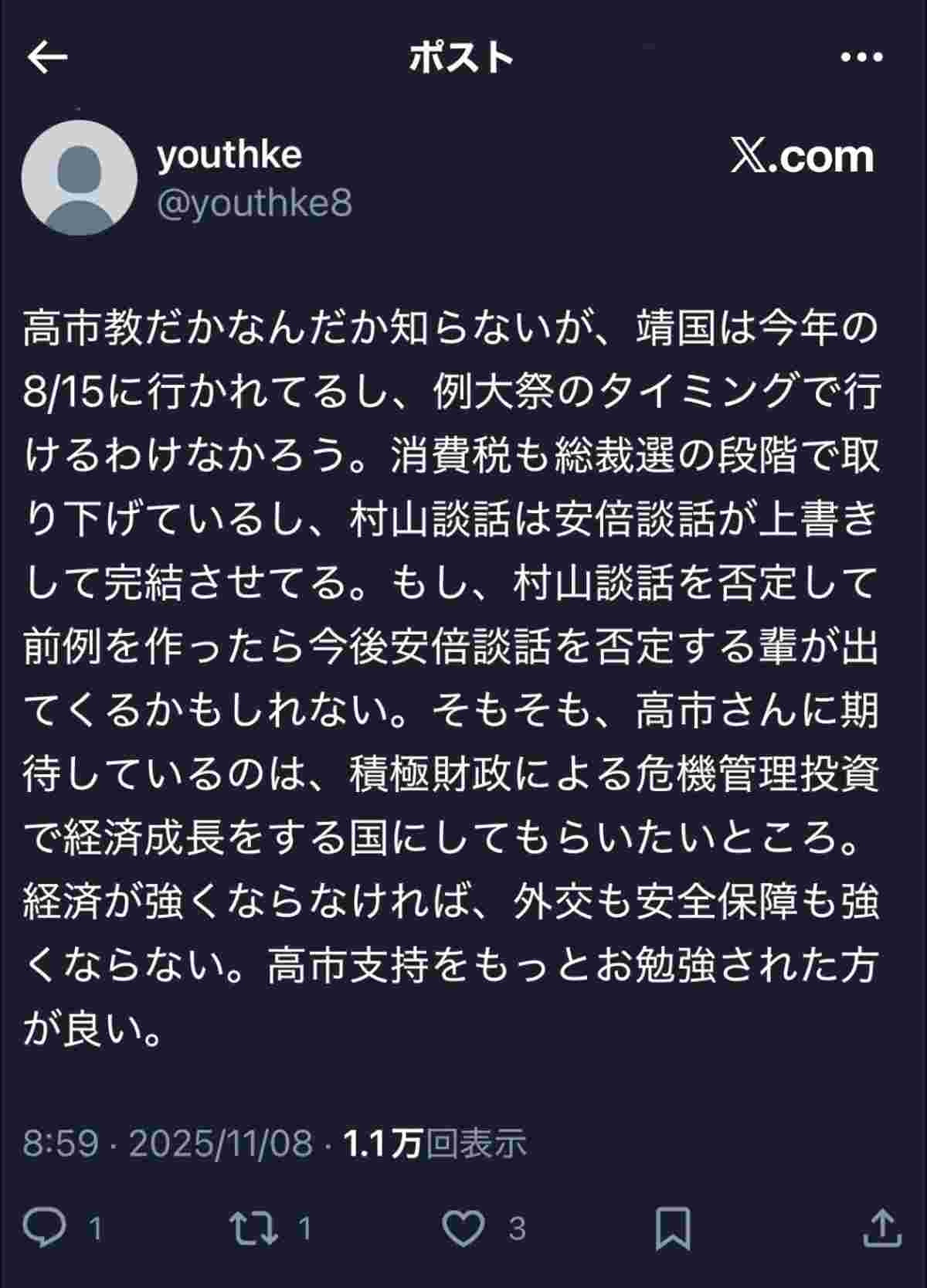 識者「靖国参拝を見送り、村山談話を継承した高市早苗をなぜネトウヨは支持するのか?」→大炎上🔥