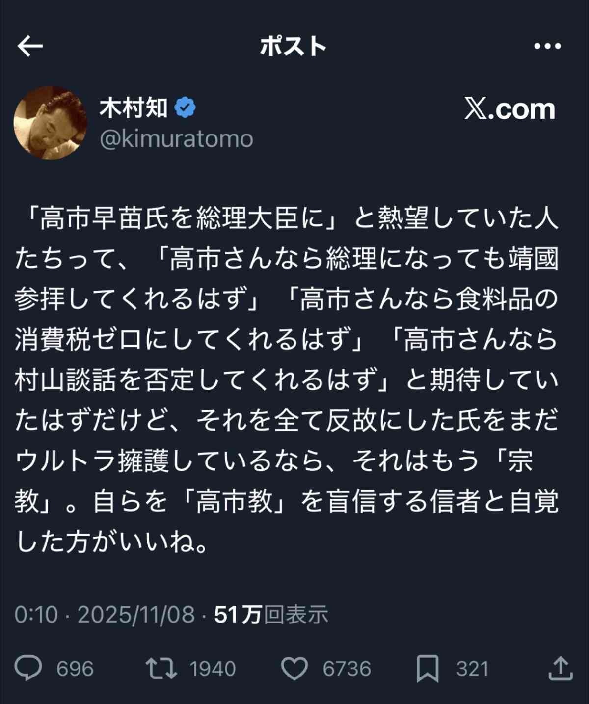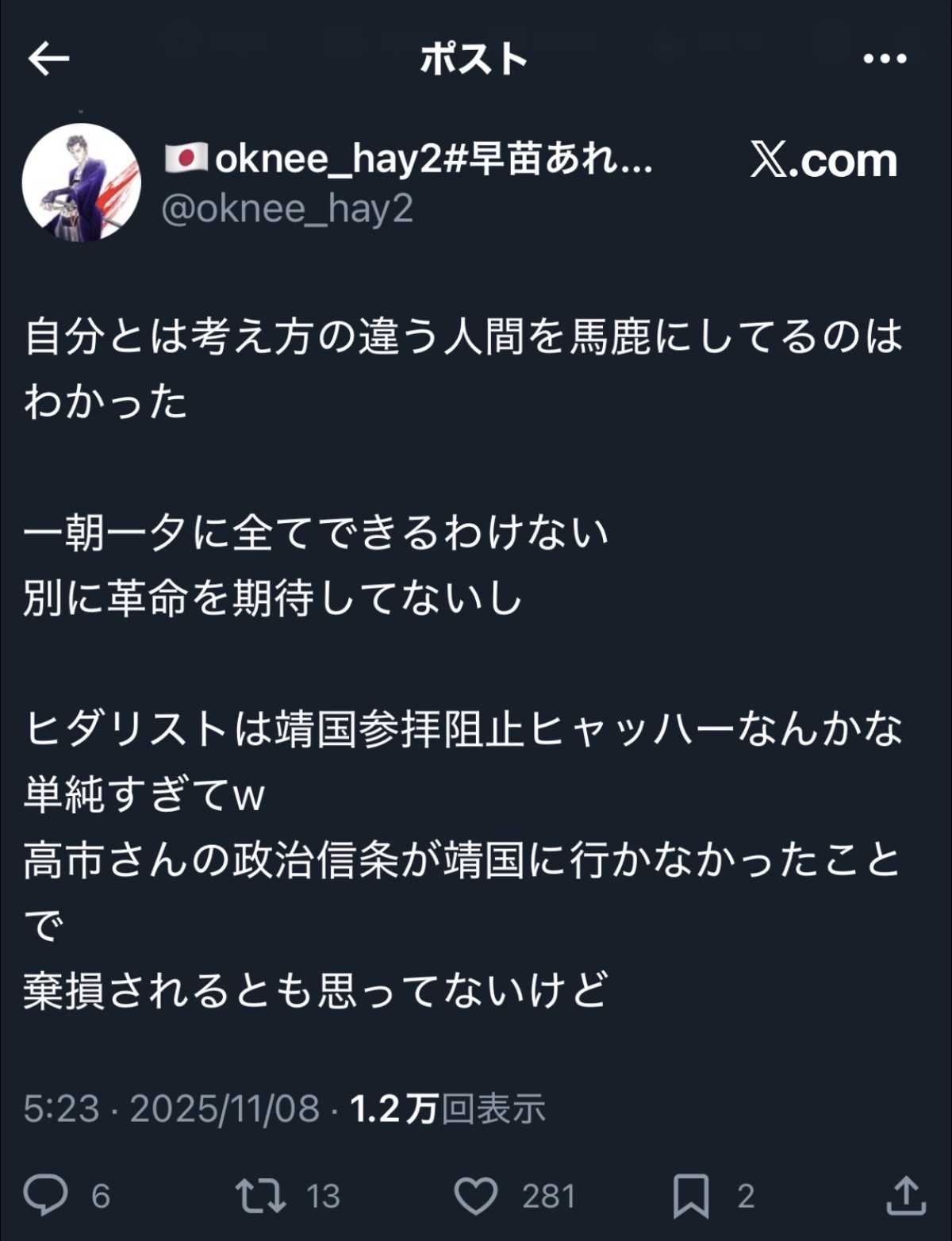実際ネトウヨに本当に政治思想などという立派なものがあれば高市を支持する理由既に消し飛んでるんだよな