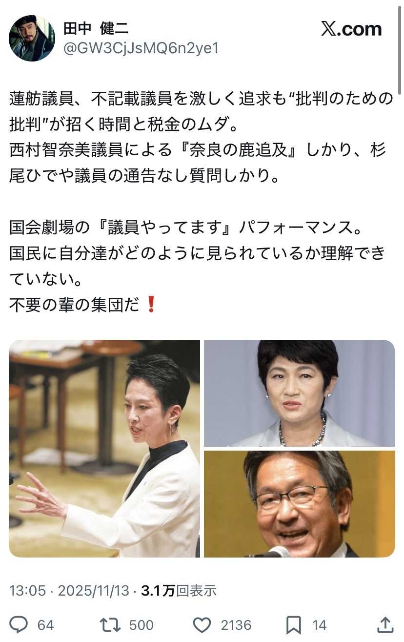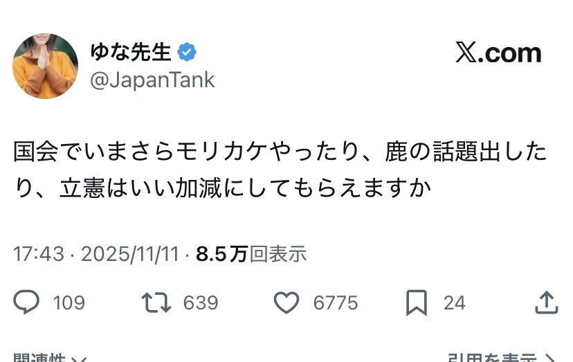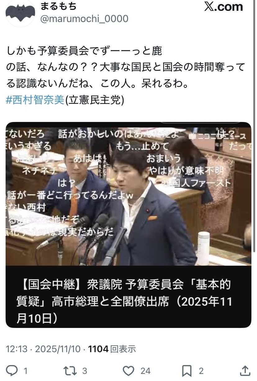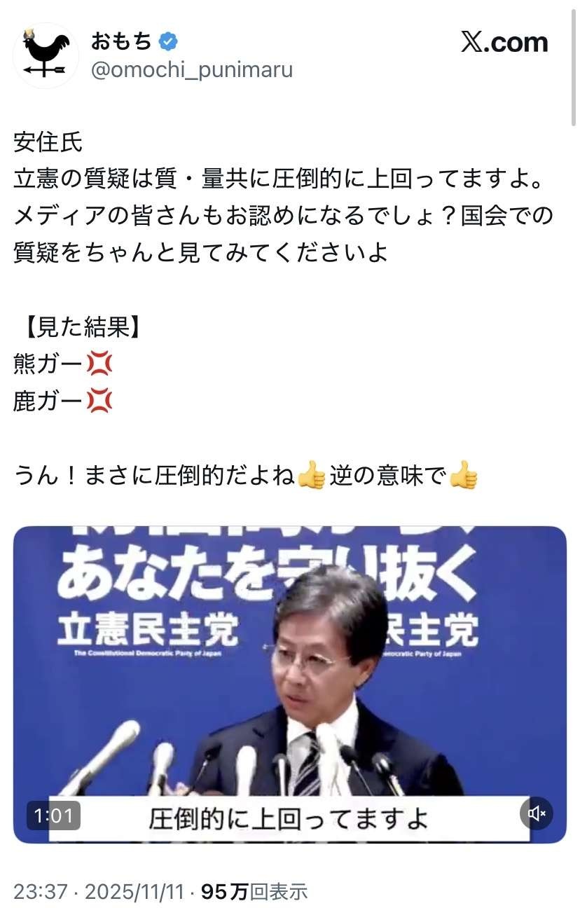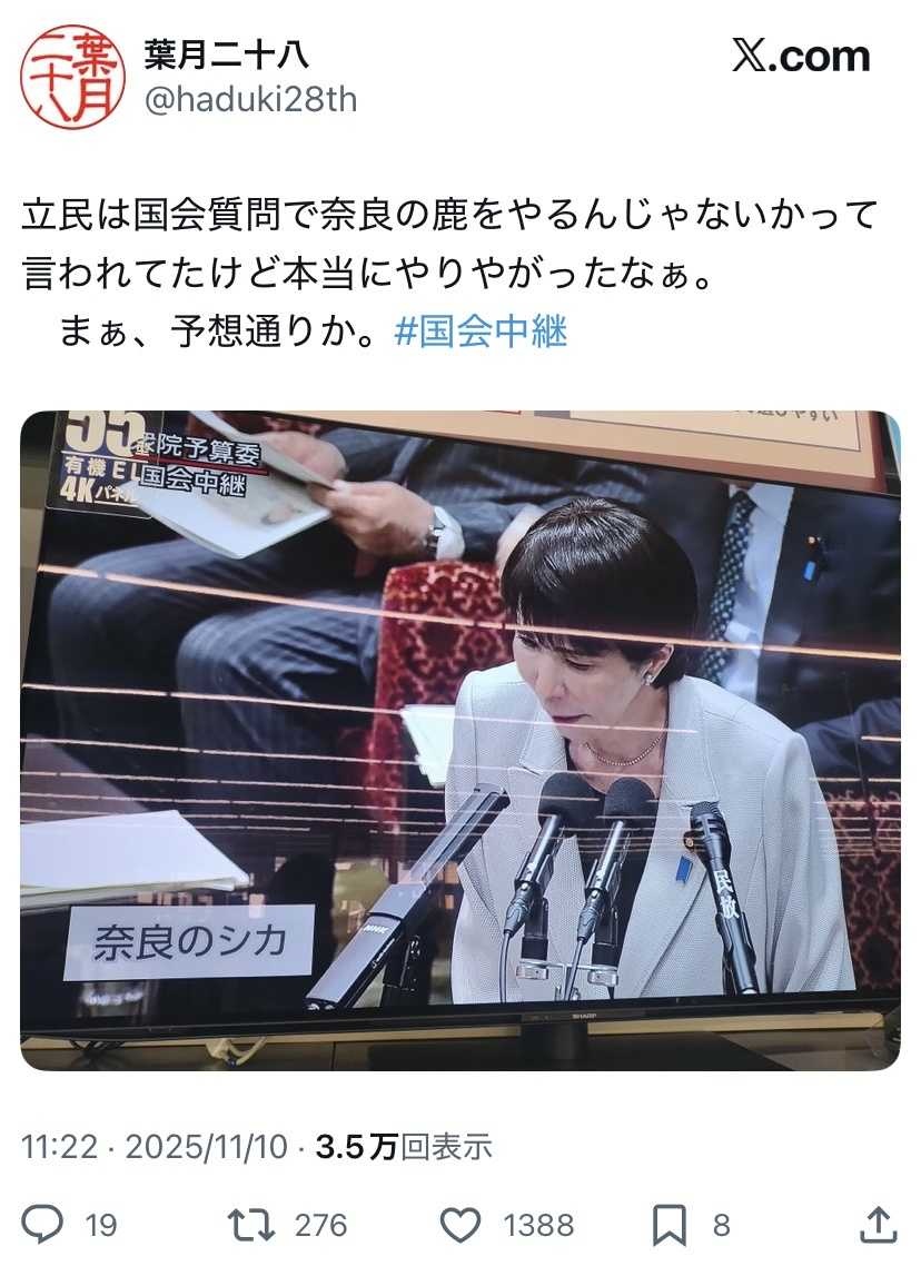 愛国者「なんで国会で鹿の話してんだよ!高市さんの時間を無駄にするな。いい加減にしろ立憲💢」