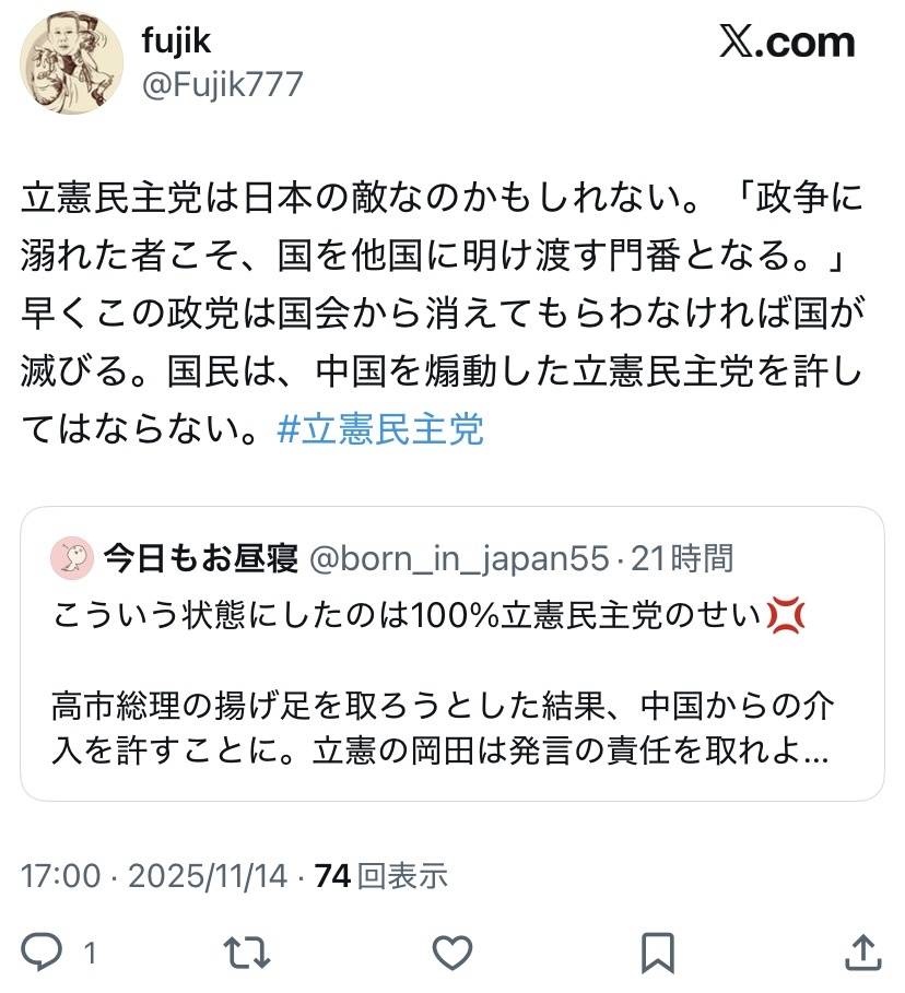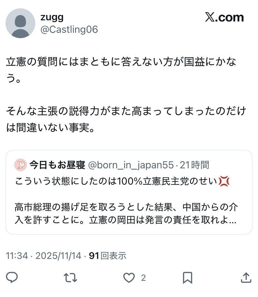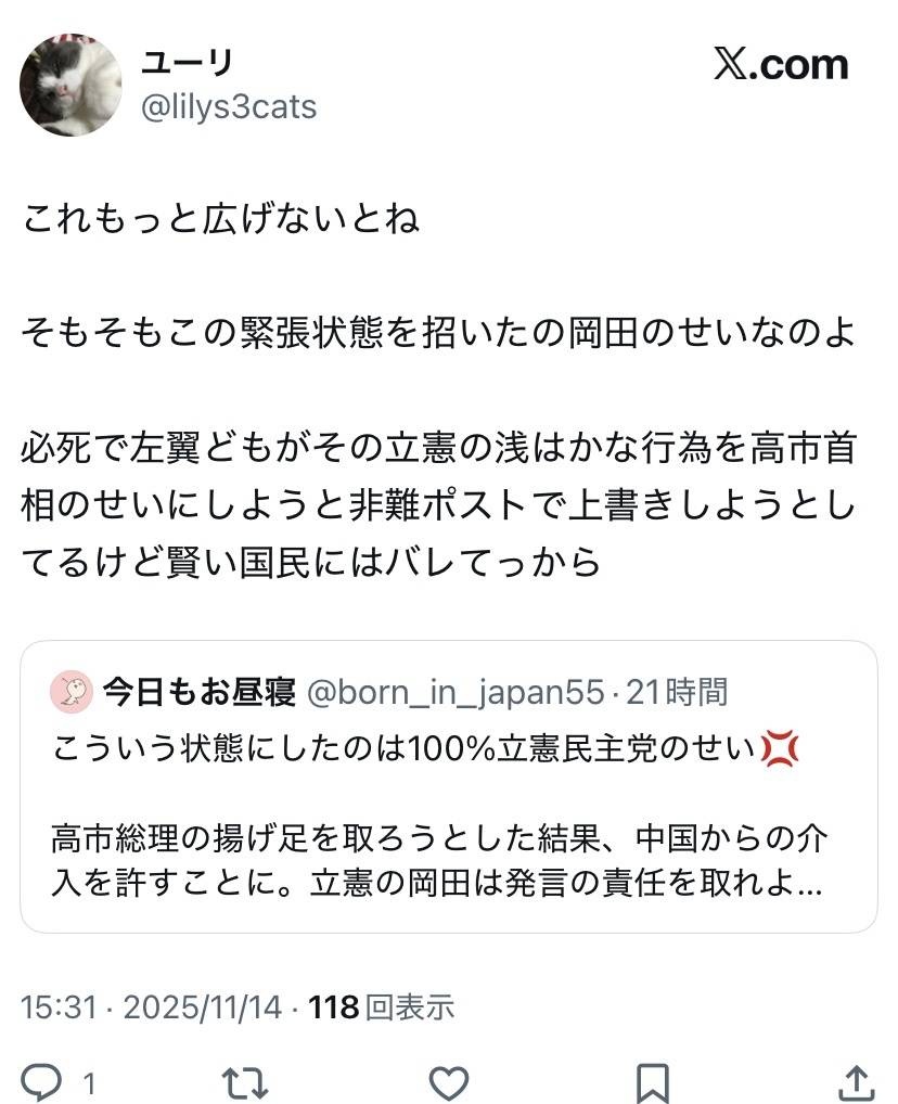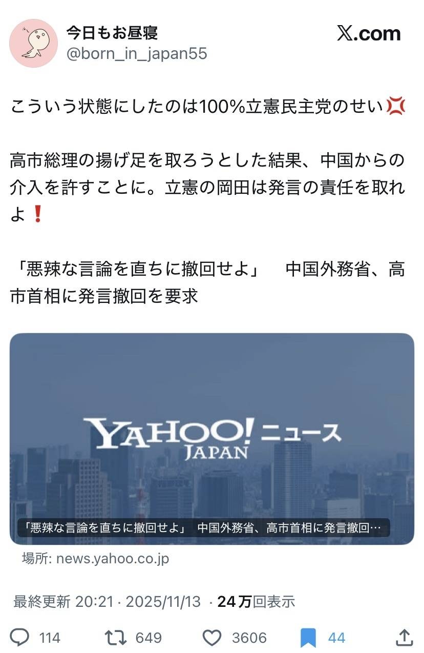 悪いのはあんな答弁をした高市自民党ですよーwww