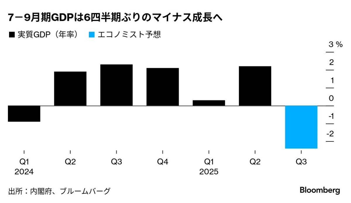 明治安田総合研究所の小玉祐一フェローチーフエコノミストは、景気は拡大基調にはあるものの、7-9月は「全体的に少し弱めの推移が続いた」と指摘。マイナス成長は高市政権にとって「大型の景気対策を打ち出す理由付けにはなるだろう」との見方を示した。