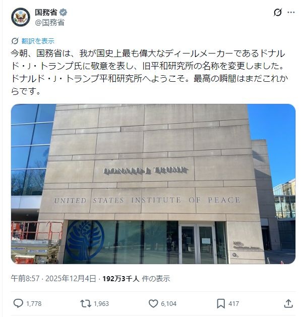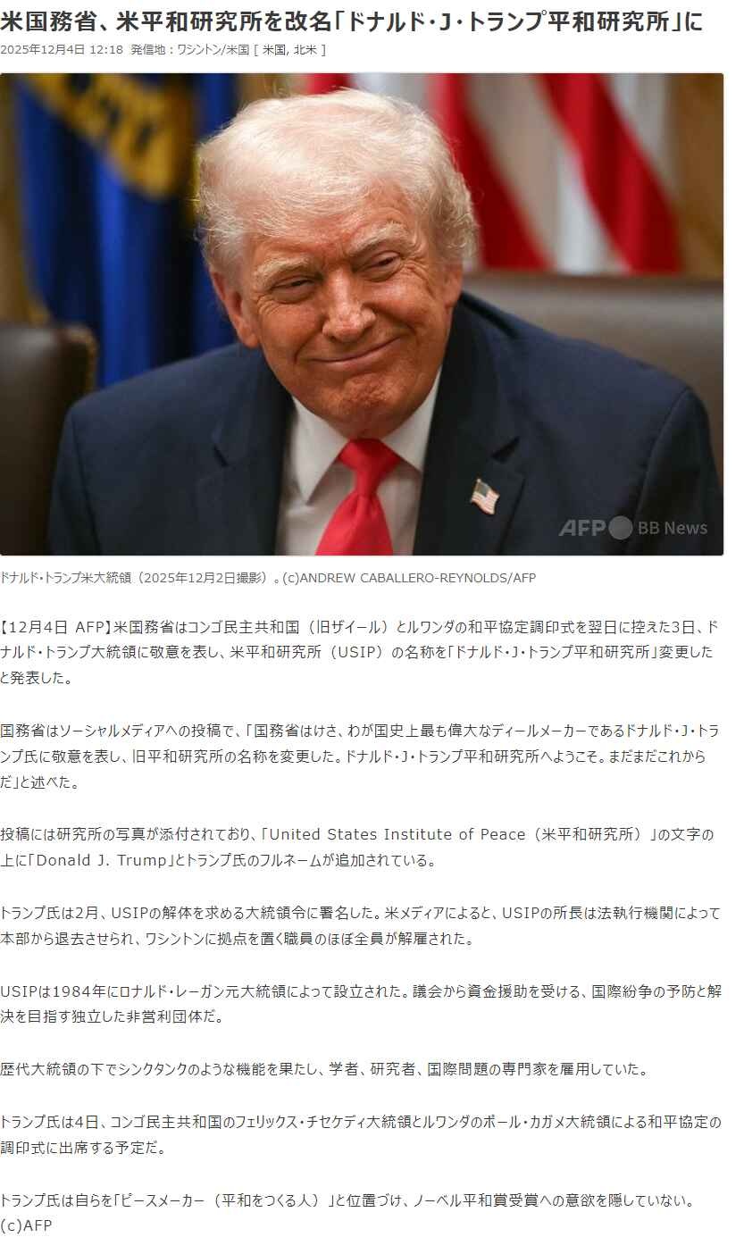 米国務省、米平和研究所を「ドナルド・J・トランプ平和研究所」に改名ノーベル平和賞をアピール