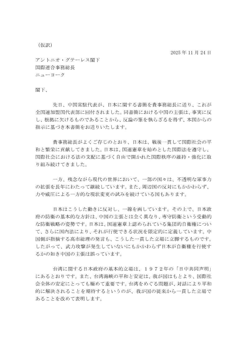国連日本代表『高市答弁は従来通りなのに、中国が難癖つけてくる』として事務総長に書簡
