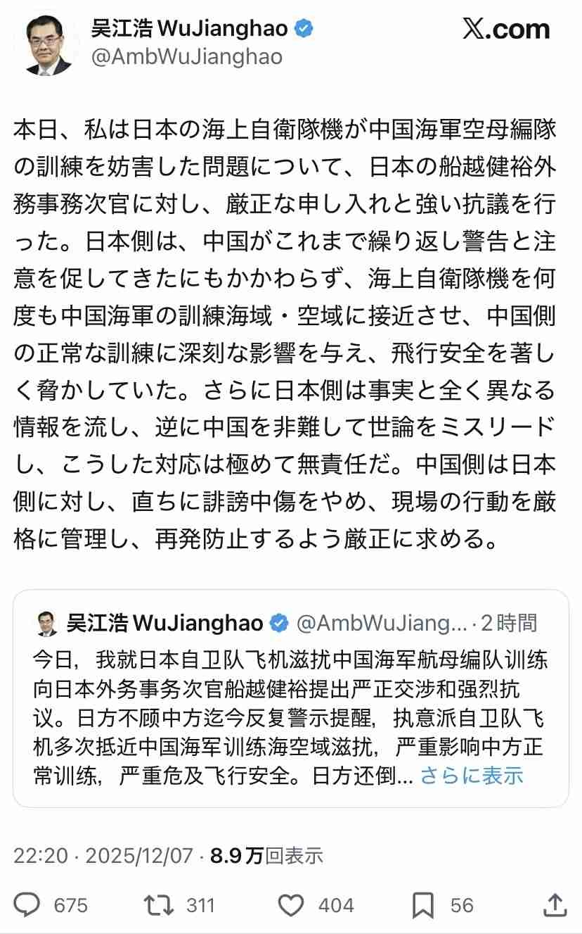 沖縄本島南東の公海上空で自衛隊機にレーダー照射を断続的に行ったことについて、外務省の船越健裕事務次官は7日午後、中国の呉江浩大使を呼び出し強く抗議しました。