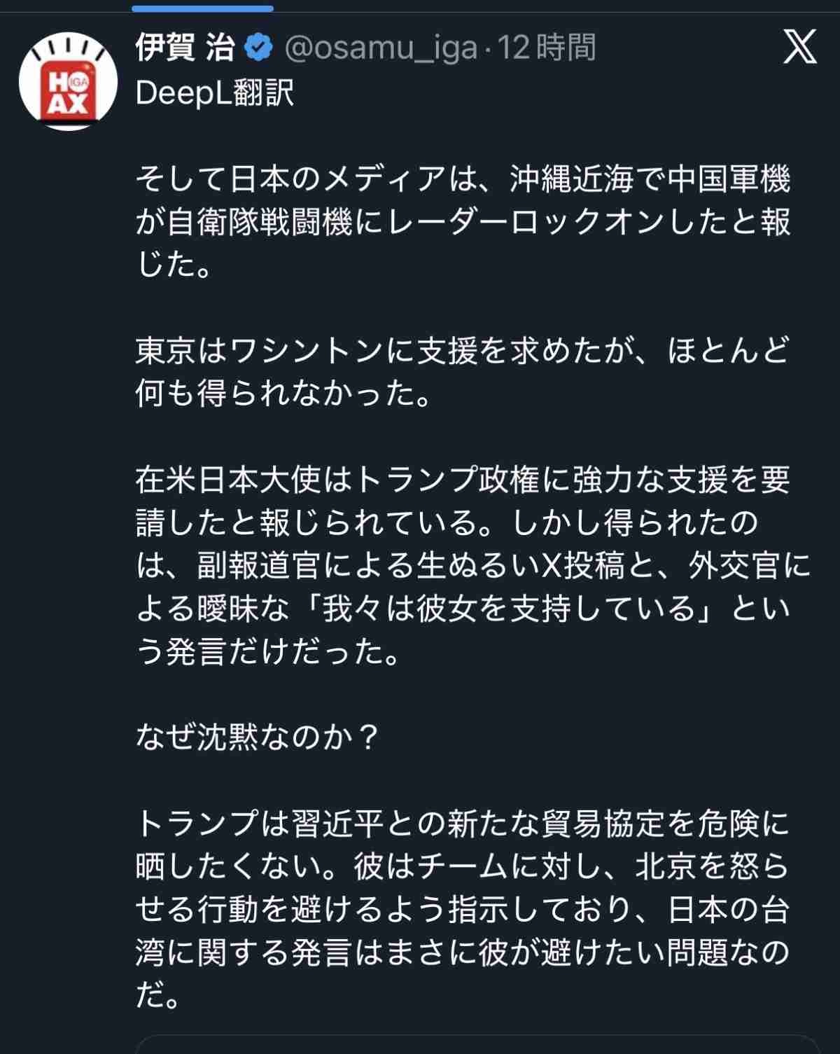 トランプは習近平との新たな貿易協定を危険に晒したくない。彼はチームに対し、北京を怒らせる行動を避けるよう指示しており、日本の台湾に関する発言はまさに彼が避けたい問題なのだ。米国防長官「韓国イスラエルポーランドのような模範同盟には特典」…ただ乗りする国には警告