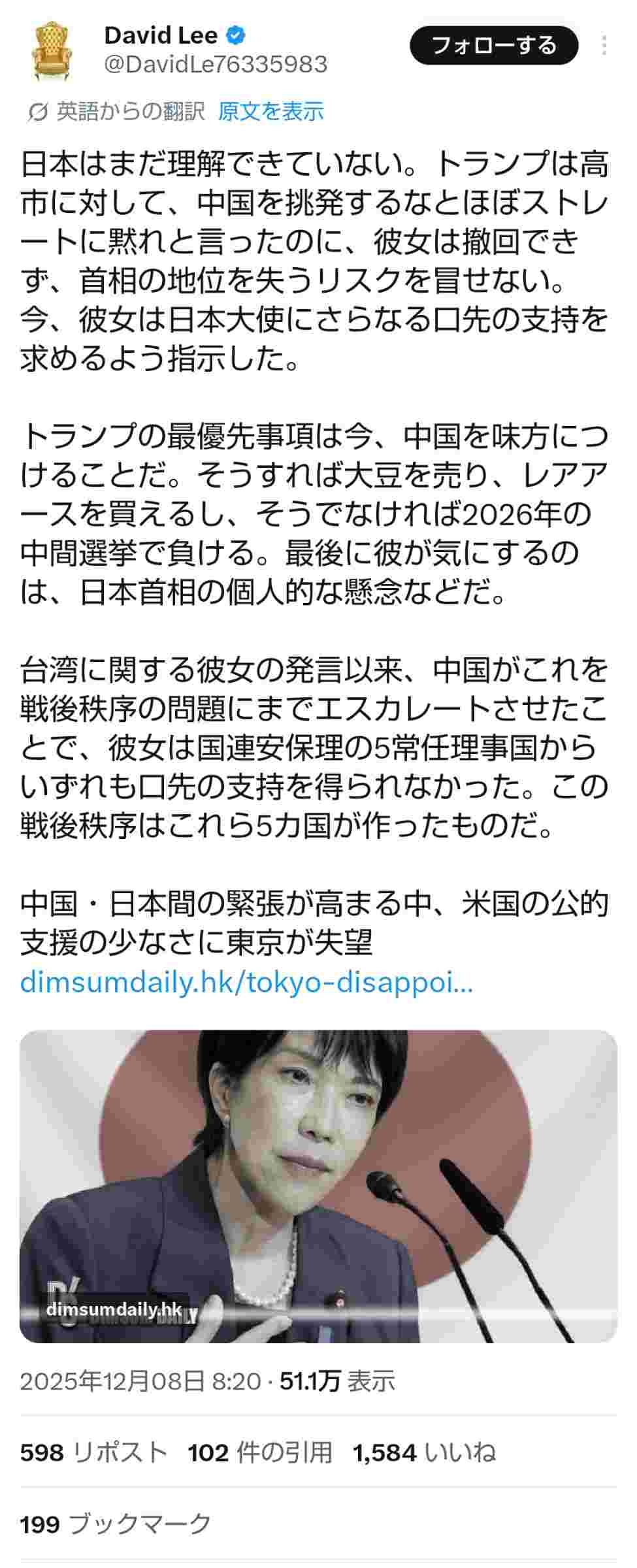 トランプでさえ中国と喧嘩しても何のメリットないのわかってるのに、アホの高市は喧嘩売って国益損ねてるから売国奴だよ