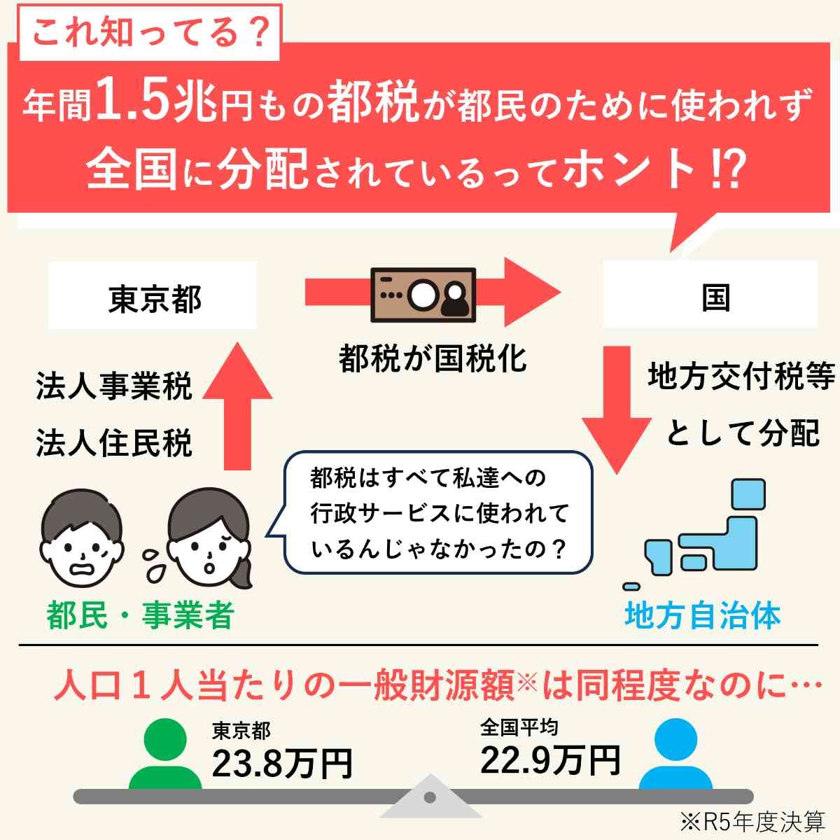 これ知ってる?年間1.5兆円💴もの都税が都民のために使われず、全国に分配されているってホント🤔⁉は、「偏在是正」の名の下に、都民の皆様が納めた貴重な税金のうち、年間約1.5兆円が国に奪われ、地方交付税等として分配されています。