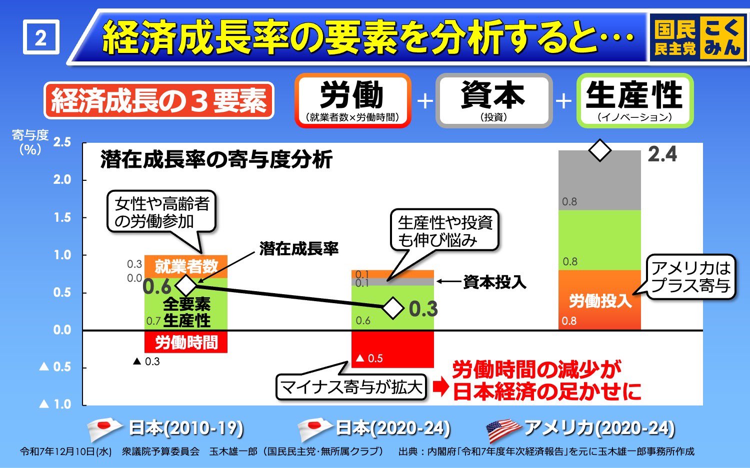これを要素分解し、潜在成長率2.4%の米国と比較すると、日本が取り組むべき課題が浮き彫りになります。