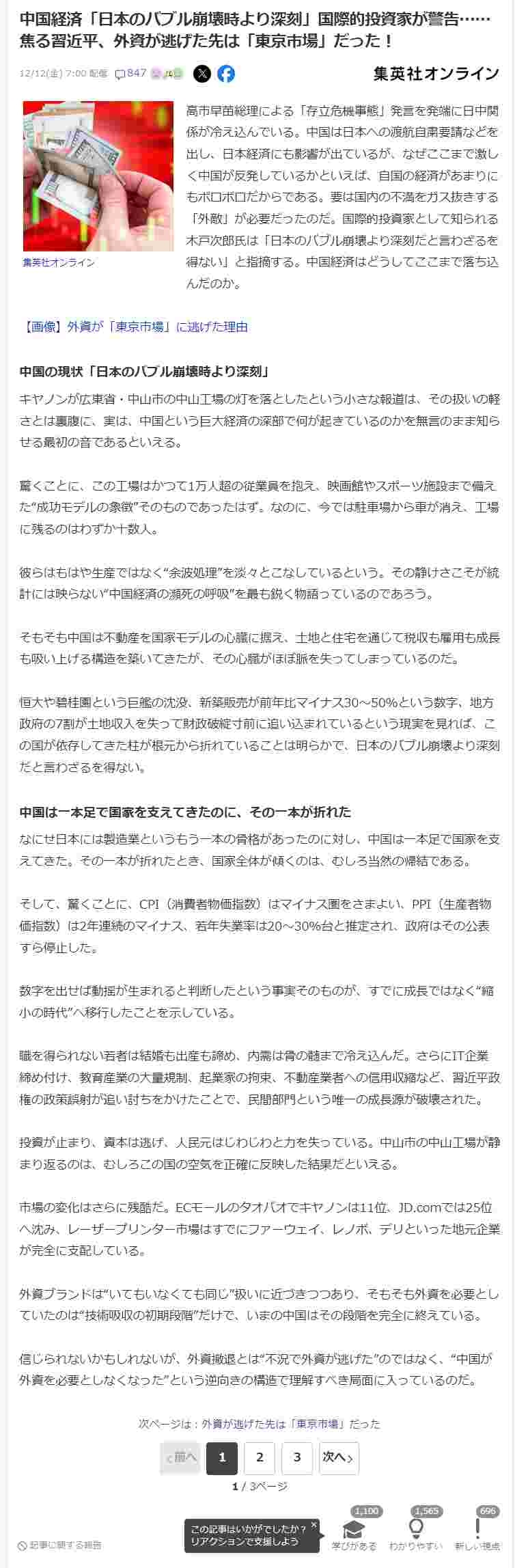 外資に逃げられても世界最大の市場、世界の工場の実体がなくなるわけじゃないしアメリカがトランプ関税で他の国とつながりが薄くなる分が中国にいく流れもあるしなあ