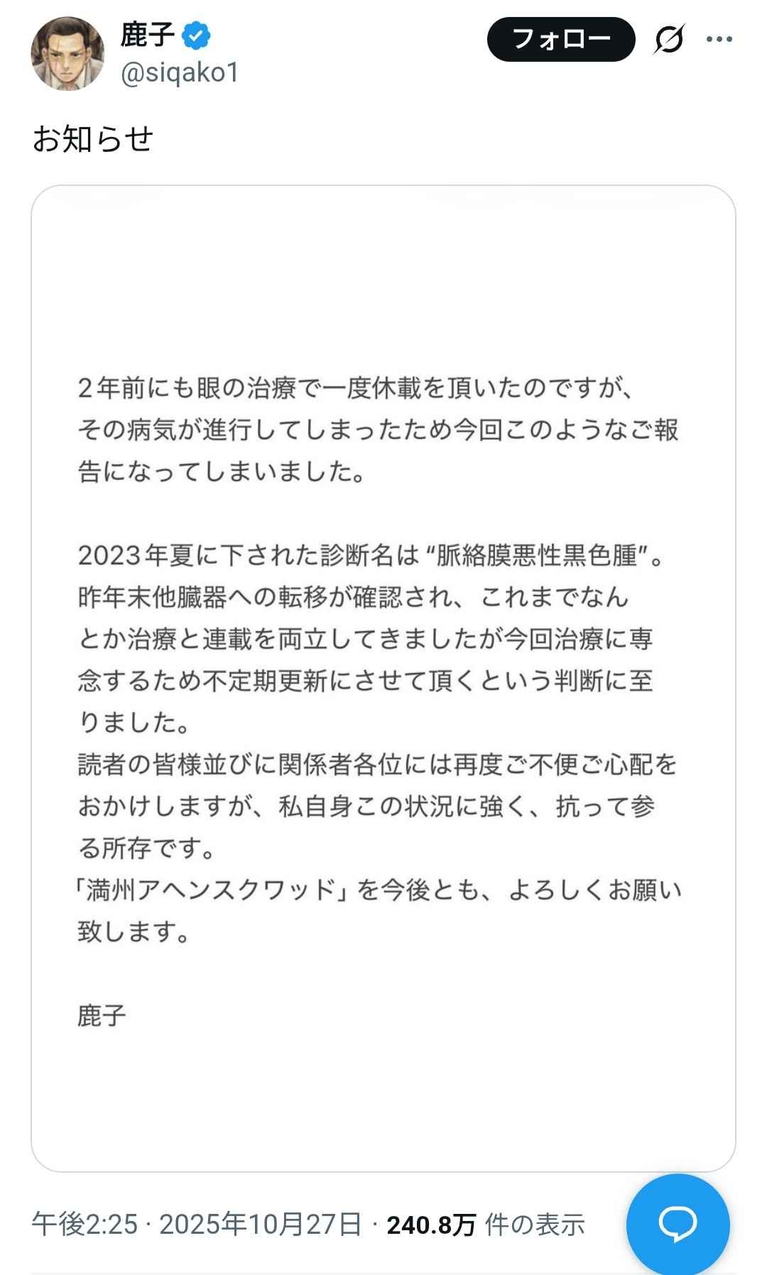 改めて休載告知の文面読んだら確かに悪性黒色腫とか他臓器への転移とか相当不穏な単語が並んでいるんだよな