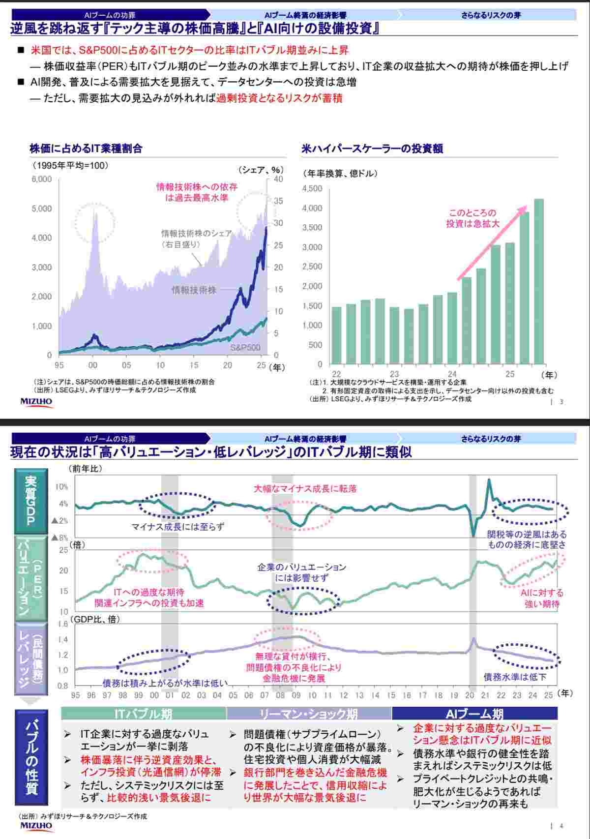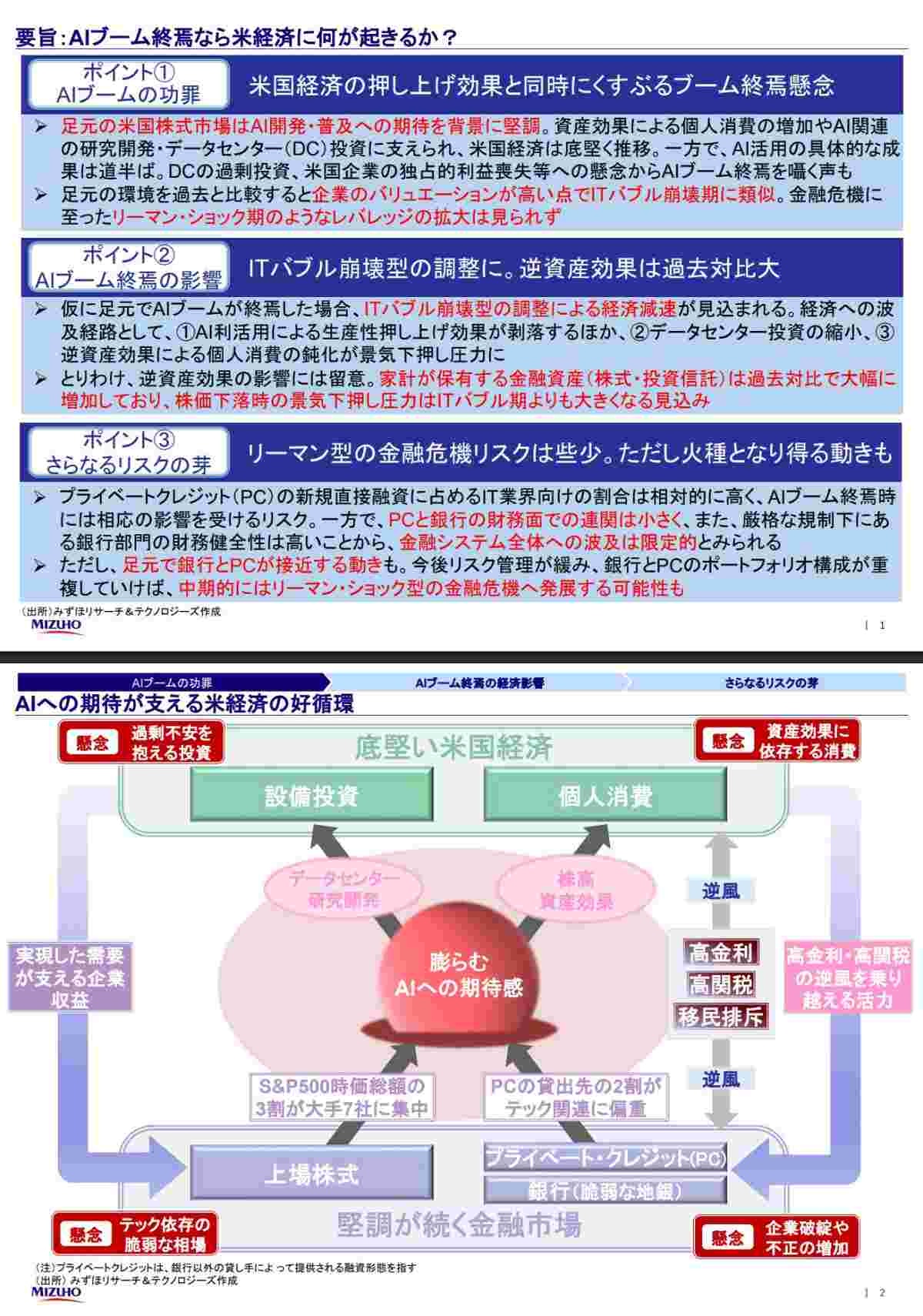 ・仮に足元でAIブームが終焉した場合、ITバブル崩壊型の調整による経済減速が見込まれる。経済への波及経路として、①AI利活用による生産性押し上げ効果が剥落するほか、②データセンター投資の縮小、③逆資産効果による個人消費の鈍化が景気下押し圧力に
