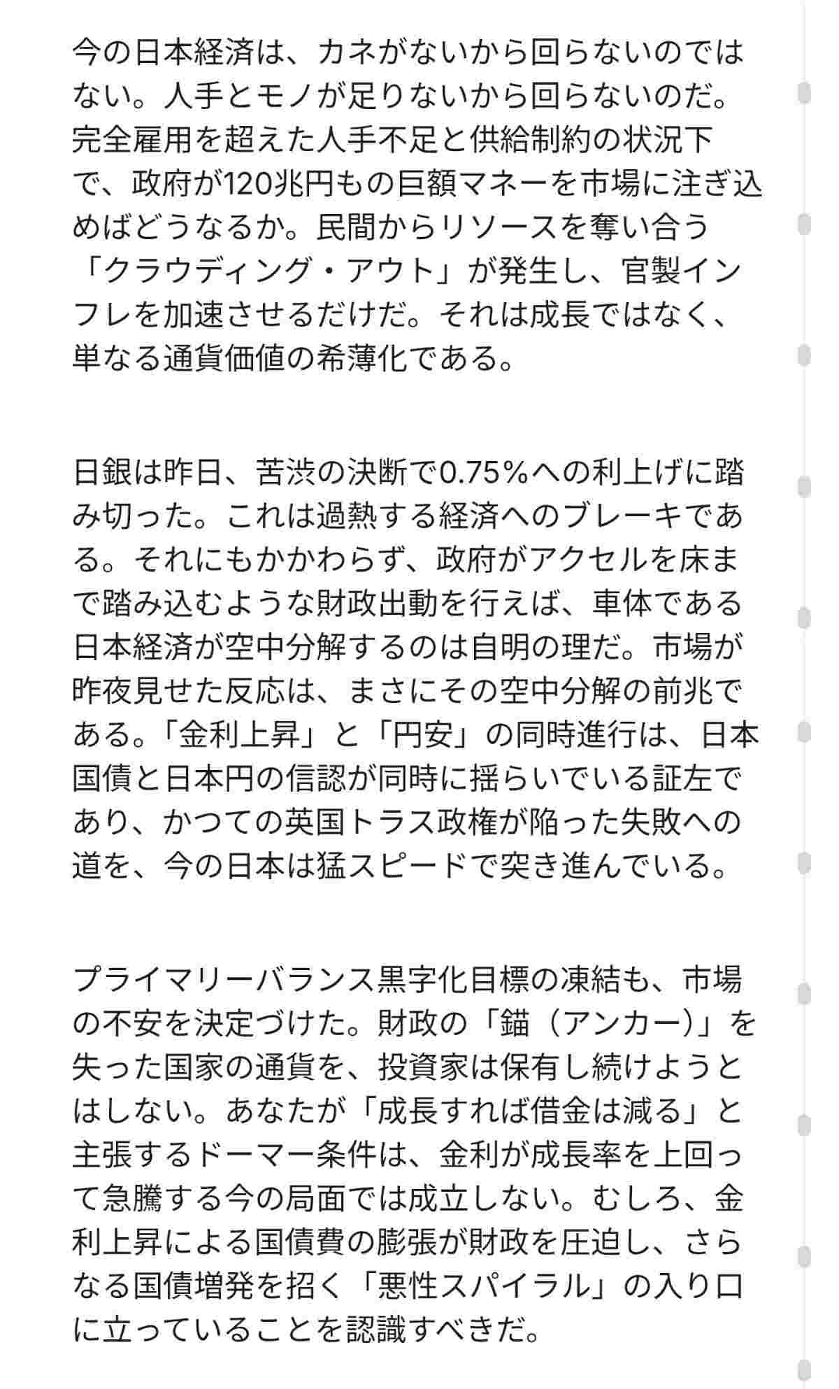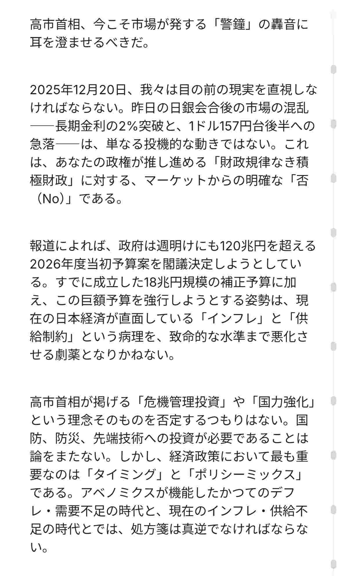 長期金利2%超えと円急落の同時進行は、政権が進める「財政規律なき積極財政」への市場からの明確な拒絶反応だ。英国トラス政権の失敗を彷彿とさせるこの動きは、日本国債と通貨への信認崩壊の予兆であり、これを無視すれば取り返しのつかない危機を招く。・インフレ下でのバラマキは劇薬だ