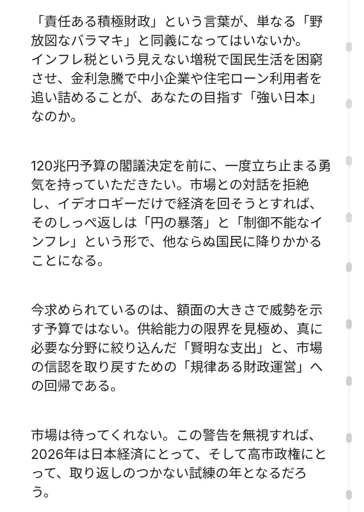 閣議決定を前に立ち止まり、額面重視の膨張予算を再考すべきだ。市場の信認を取り戻すため、真に必要な分野に絞った「賢明な支出」と財政規律への回帰こそが、今求められる真の「責任ある政治」である。警告全文