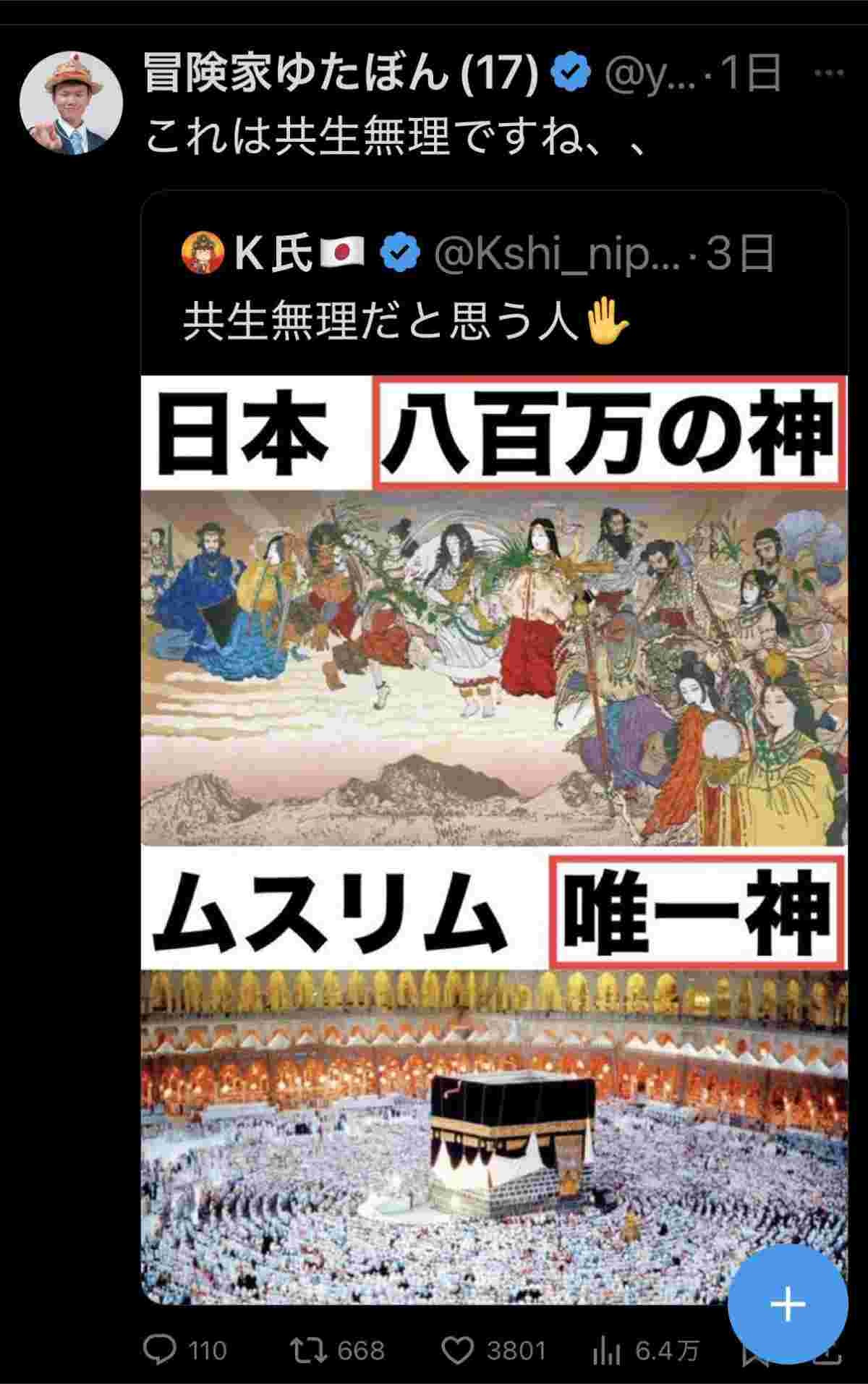 バカウヨ「八百万の神を崇める日本人と唯一神を崇めるムスリムは共生なんか無理ィ!」冒険家ゆたぽんさん「ほんまやでワレ!」