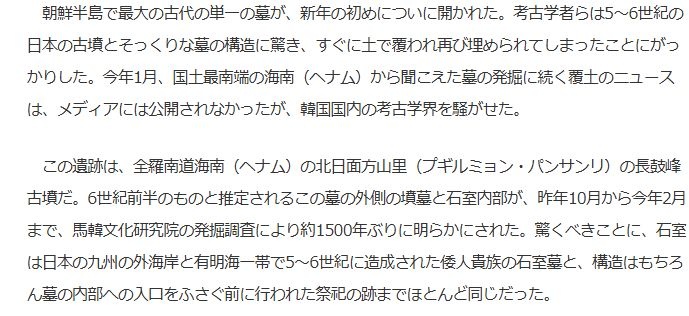 朝鮮半島で最大の古代の単一の墓が、新年の初めについに開かれた。考古学者らは5~6世紀の日本の古墳とそっくりな墓の構造に驚き、すぐに土で覆われ再び埋められてしまったことにがっかりした。今年1月、国土最南端の海南(ヘナム)から聞こえた墓の発掘に続く覆土のニュースは、メディアには公開されなかったが、韓国国内の考古学界を騒がせた。