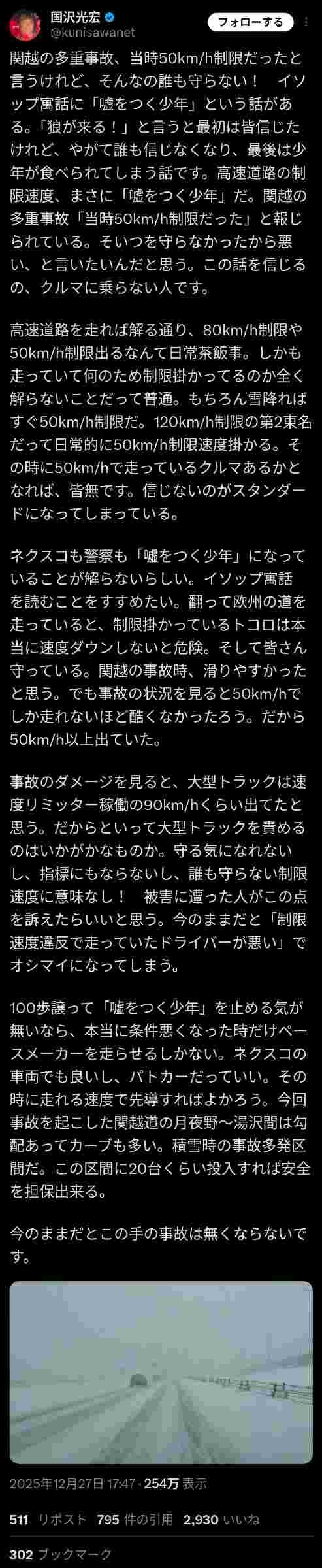 いやこいつの文面見るに事故時の関越自動車道も50km制限しなくて良いと言ってるんだが