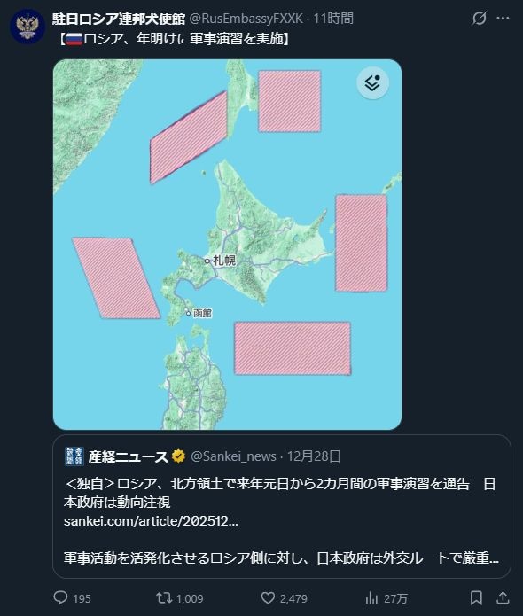 ロシアが、不法占拠している北方領土周辺で、来年元日から新たな軍事演習を行うと通告したことが28日、日本政府関係者への取材で分かった。ロシアは今年、北方領土周辺での演習を相次いで通告し、日本を含む各国船舶の「無害通航権」を一方的に停止した。軍事活動を活発化させるロシア側に対し、日本政府は外交ルートで厳重に抗議し、動向を注視する。