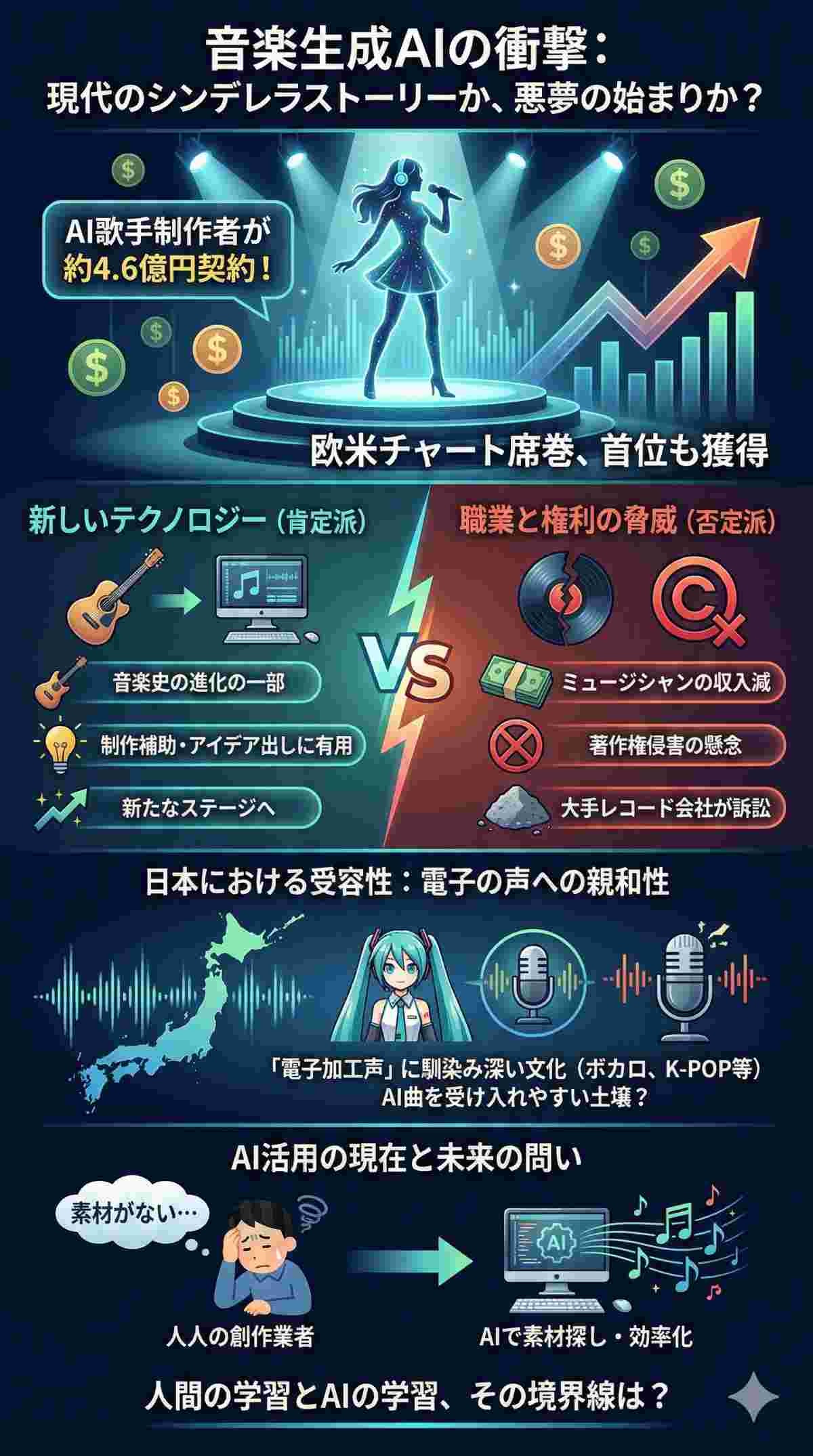 ・欧米ではAI生成楽曲がチャートを席巻し、AI歌手の制作者が巨額契約を結ぶなどビジネス化が加速している。一方で、職業的脅威や著作権侵害を巡り大手レーベルが開発企業へ訴訟を起こすなど、業界内では新技術としての歓迎と強い反発で賛否が割れている。