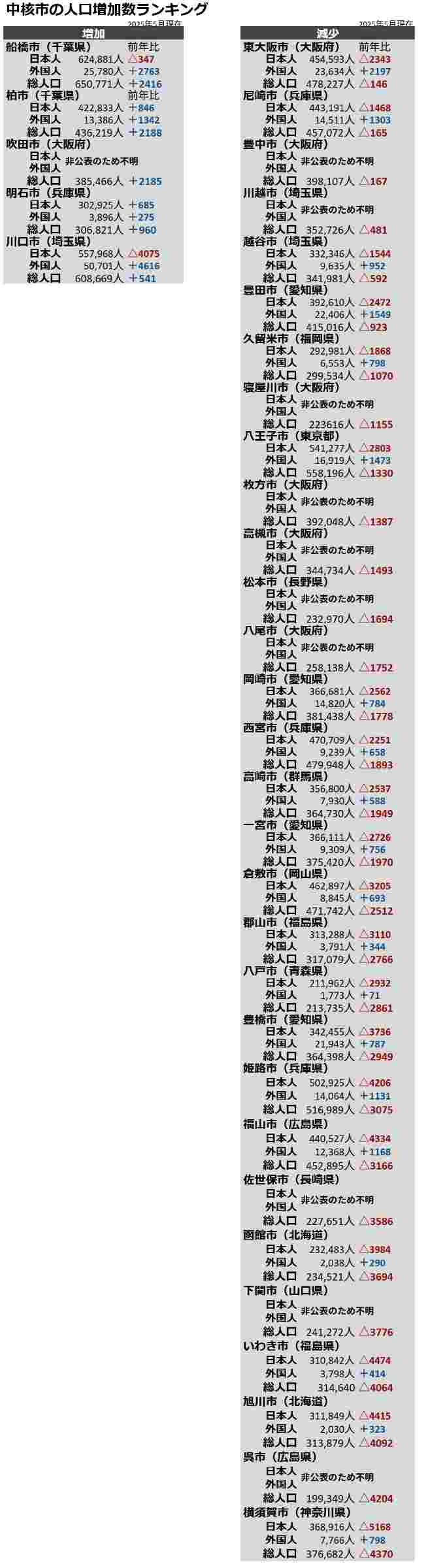 中核市の人口ランキング