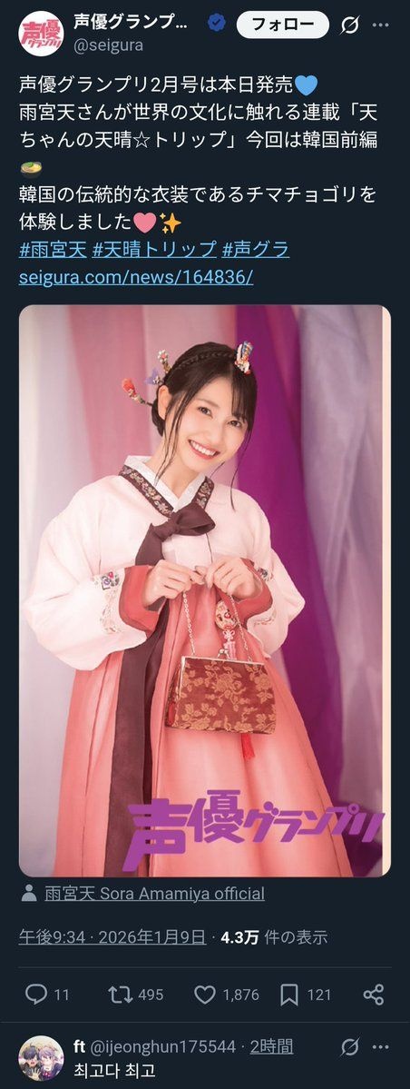 声優の雨宮天さん、韓国伝統衣チマチョゴリを装いなられる
