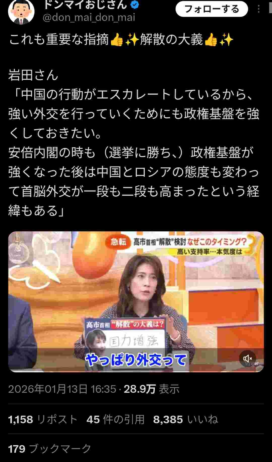 「国民なめられてる…今だったら人気が高いから過半数取れるだろうってだけの何ら大義のない選挙だと思う…何でやるかと言ったら、高市総理の自信のなさの表れで、4月まで待ったら中国のレアースとかインフレ円安とか統一教会問題が出て人気が落ちるから今のうちにって