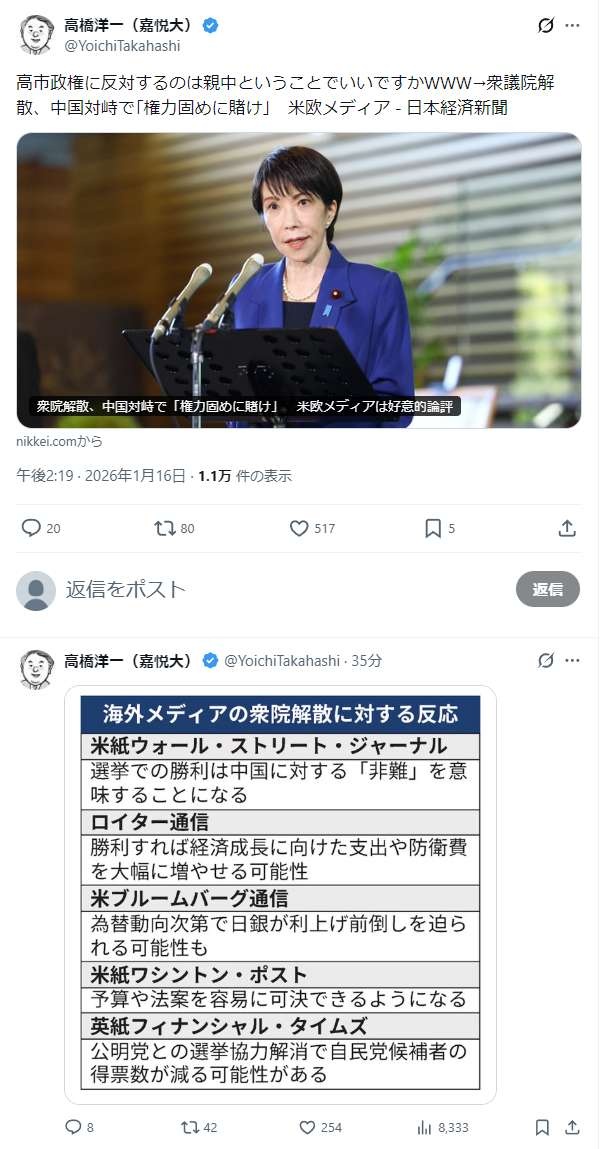 高橋洋一「高市政権に反対するのは親中ということでいいですかWWW」衆議院解散、中国対峙で「権力固めに賭け」