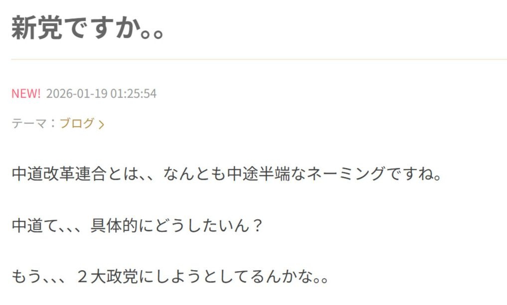 シルクは「中道改革連合とは、、なんとも中途半端なネーミングですね」と政党名についてチクリとさしつつ、「中道て、、、具体的にどうしたいん?」と疑問を投げかけ、「もう、、、2大政党にしようとしてるんかな。。立憲てさ。。。原発反対ちゃうかった?消費税減税も反対やったよね。。緊急事態条項も反対してたよね。選挙のためにコロッと変えるの?維新と変わらんな。大体野田ハンが消費税10%にしたし、、まあ実行したのは安倍ハンやけどさ。斎藤ハン、、自民と連携もありうる?石破ハンにラブコ-ル?は?どうしたいん?わからんわ。。もう、、、どっちにしても準備不足やわ」と批判を込めた。