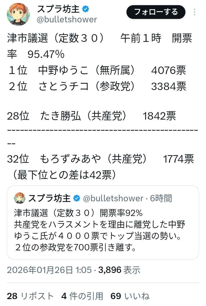 共産党をハラスメントを理由に離党した中野ゆうこ氏が4000票でトップ当選の勢い。2位の参政党を700票引き離す。