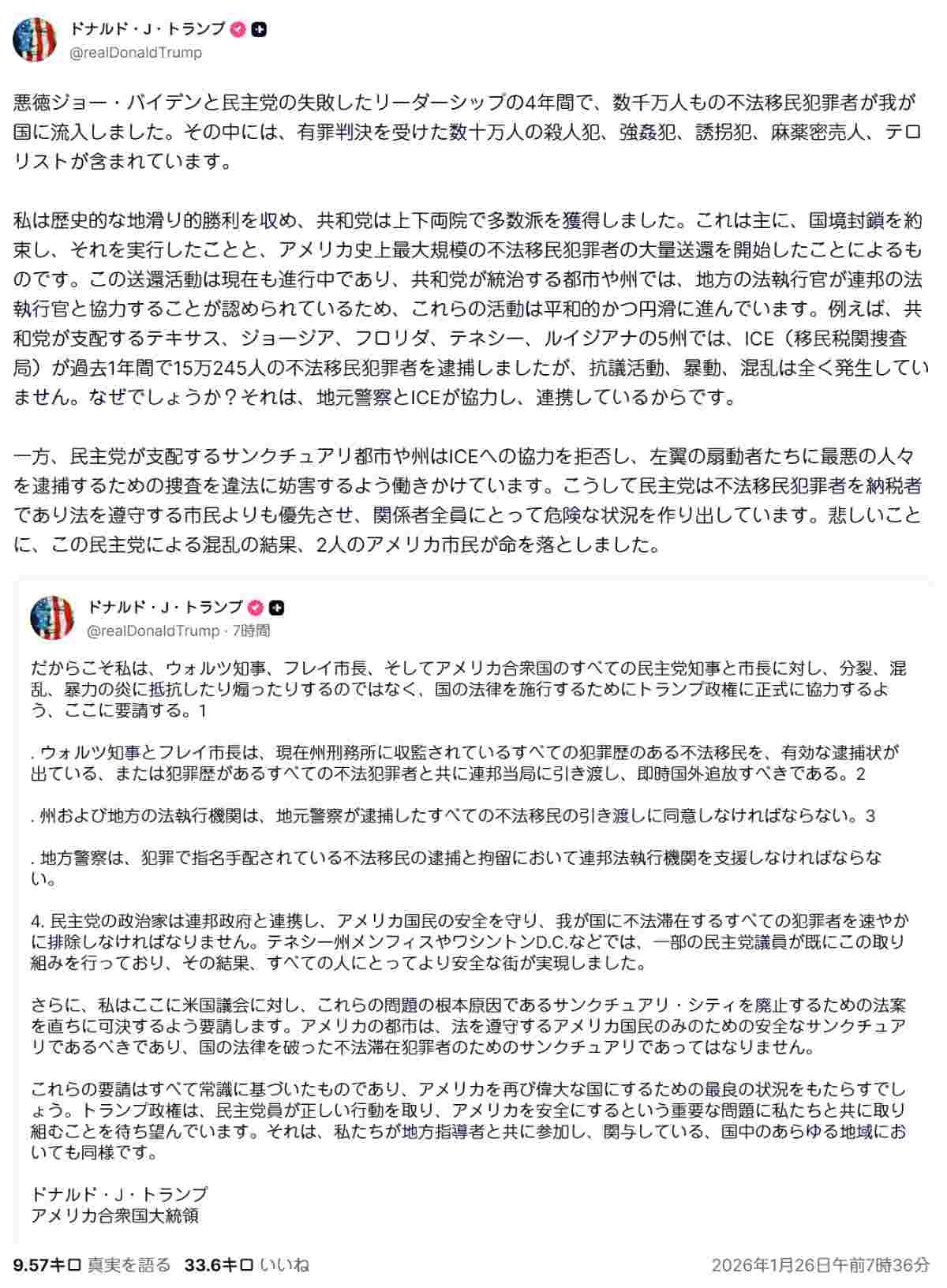 トランプ政権はレネ・グッドさんのこともアレックス・プレッティさんのことも「テロリスト」と呼んでいたのに、証拠映像のせいで嘘をつけなくなって、「悲しいことに、この民主党による混乱の結果、2人のアメリカ市民が命を落としました。」と言い方を変えた