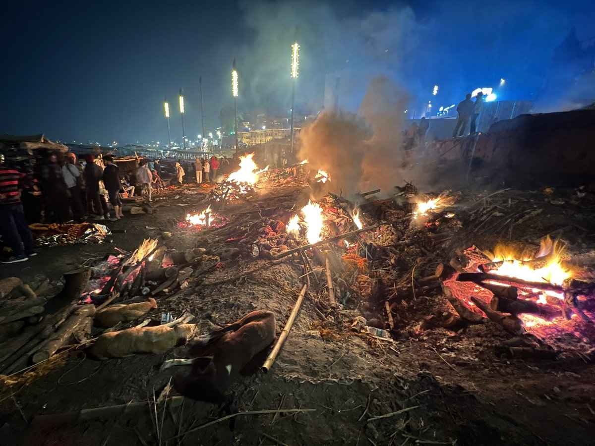 24時間絶え間なく炎が灯されるバラナシの火葬場、多くの人が誰かの火葬を見守っている。