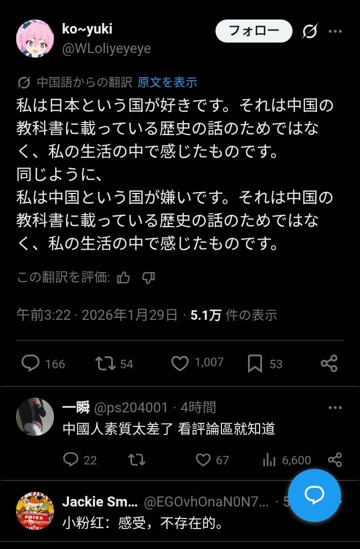 中国人「私は日本という国が好きです。私は中国という国が嫌いです。」