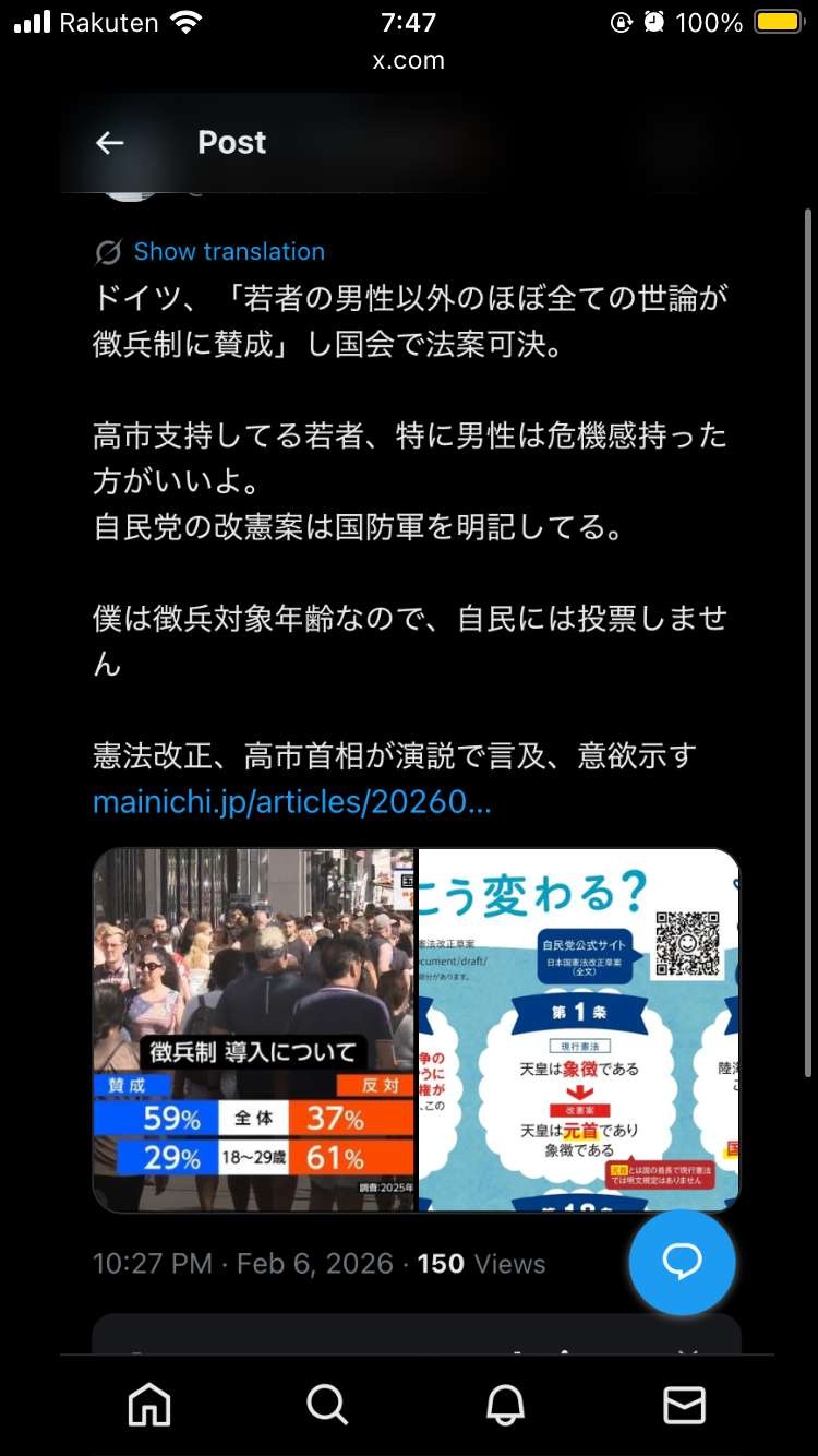ドイツと違って若者男性も高市に投票してるんだから日本は全国民徴兵賛成だよ
