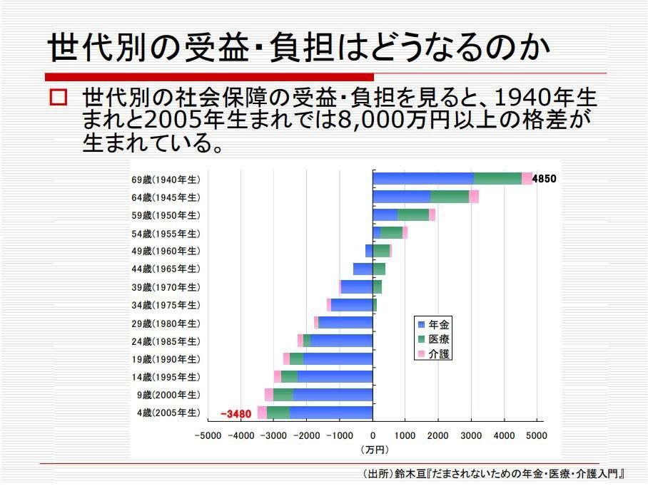 そのため、経済的な損得という視点で見ることは、本来適切ではありません。また、現在の高齢者と若い世代で給付水準に差があるという、いわゆる「世代間格差」についても、