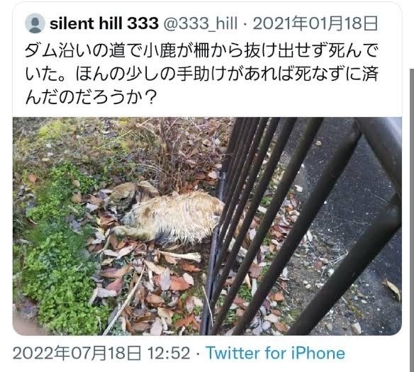 ダム沿いの道で小鹿が柵から抜け出せず死んでいた。ほんの少しの手助けがあれば死なずに済んだのだろうか?
