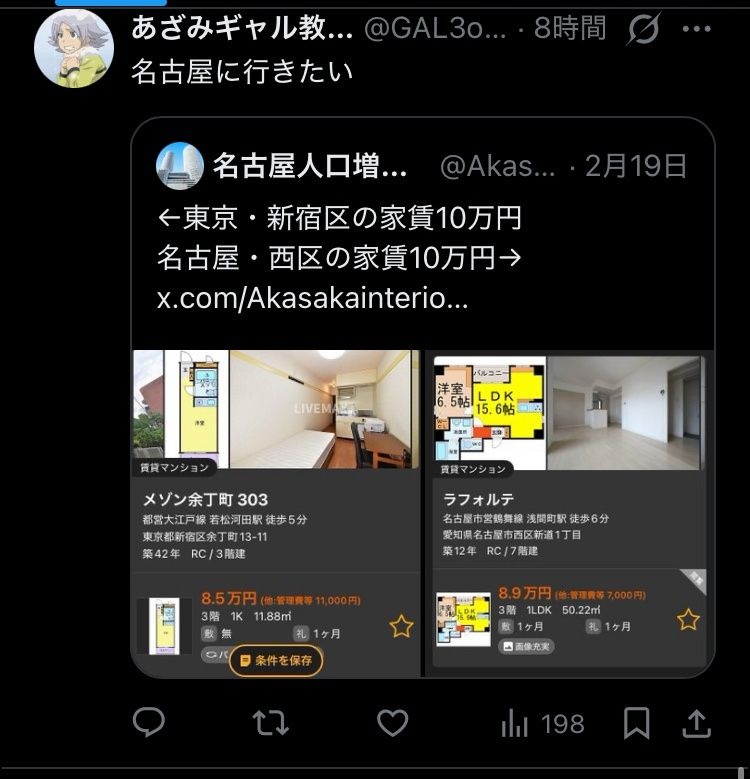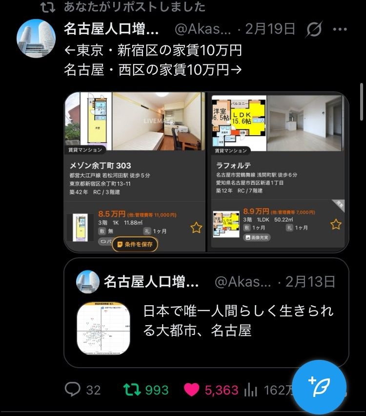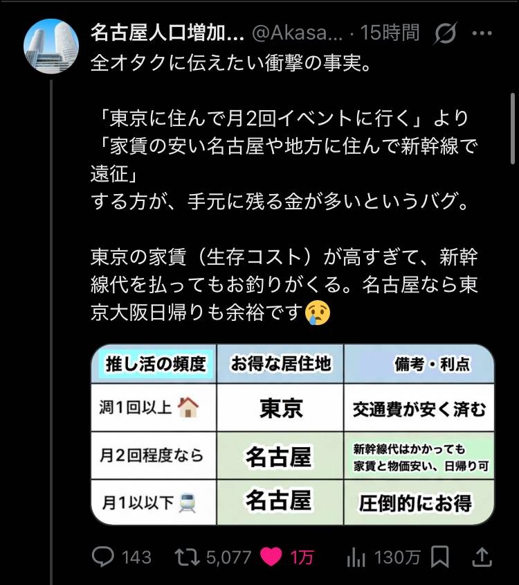 する方が、手元に残る金が多いというバグ。東京の家賃(生存コスト)が高すぎて、新幹線代を払ってもお釣りがくる。名古屋なら東京大阪日帰りも余裕です😢