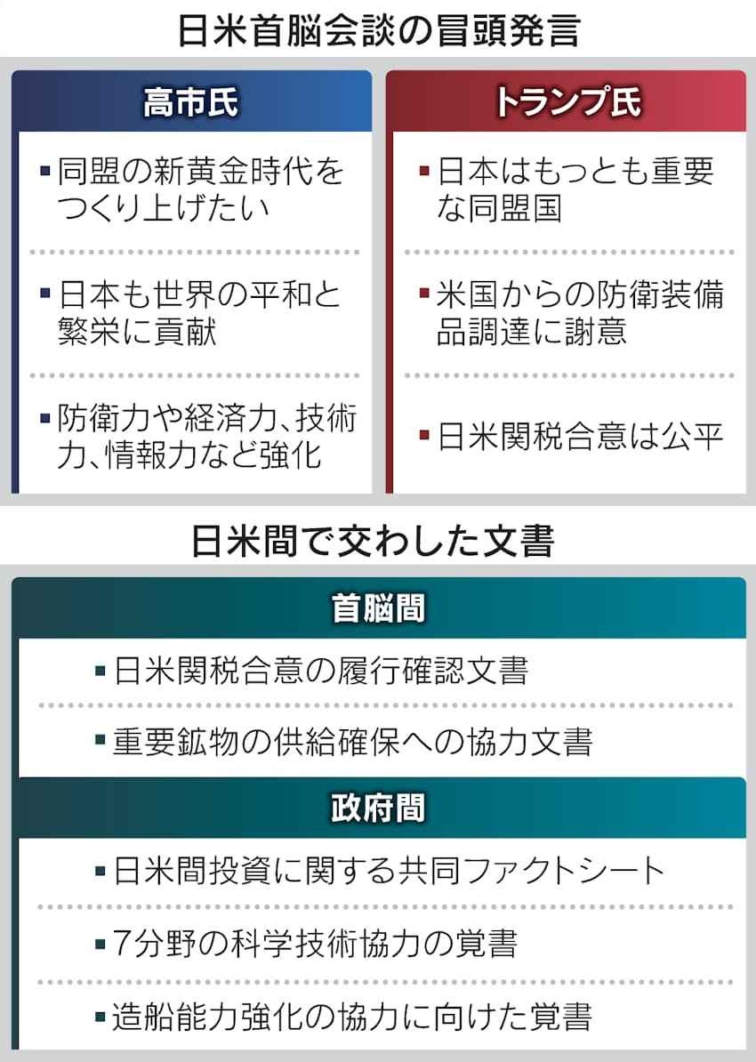 高市早苗首相は28日、東京・元赤坂の迎賓館でトランプ米大統領と会談した。両首脳は日米関税合意を「着実に履行する」と確認し、「日米同盟の新たな黄金時代」をめざすとの文書に署名した。首相は防衛力強化の方針を伝え、トランプ氏は日米関係が「今まで以上に強力になる」と述べた。