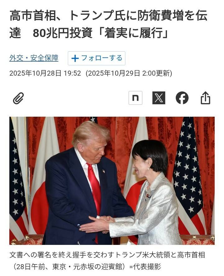 高市首相、トランプ氏に防衛費増を伝達 80兆円投資「着実に履行」