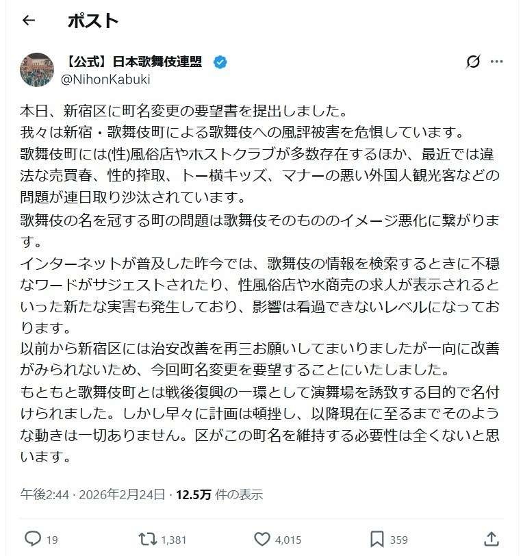 日本歌舞伎連盟「新宿・歌舞伎町のせいで深刻な風評被害を受けている。新宿区は町名を変更しろ」