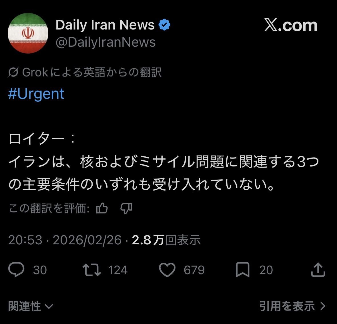 イラン、アメリカの要求を一つも受け入れない模様www