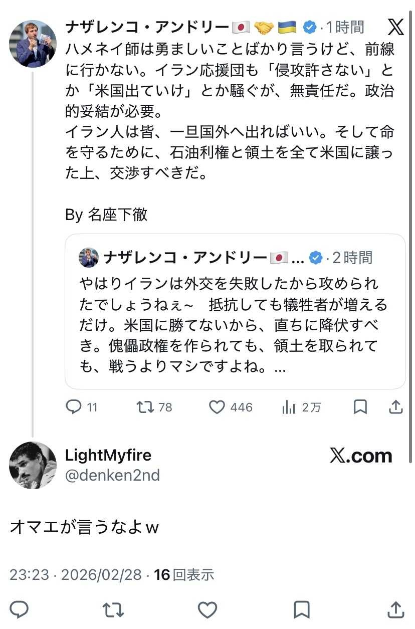 >イラン人は命を守るために一度国外に出て、石油理研と領土をすべてアメリカに譲った上、交渉すべきだ