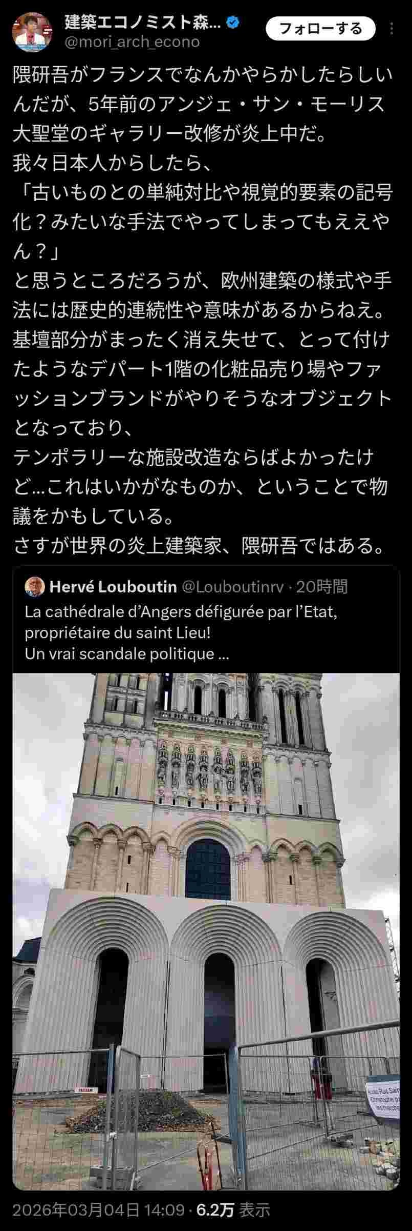 隈研吾、アンジェ大聖堂を糞リフォームしフランスで大炎上中www