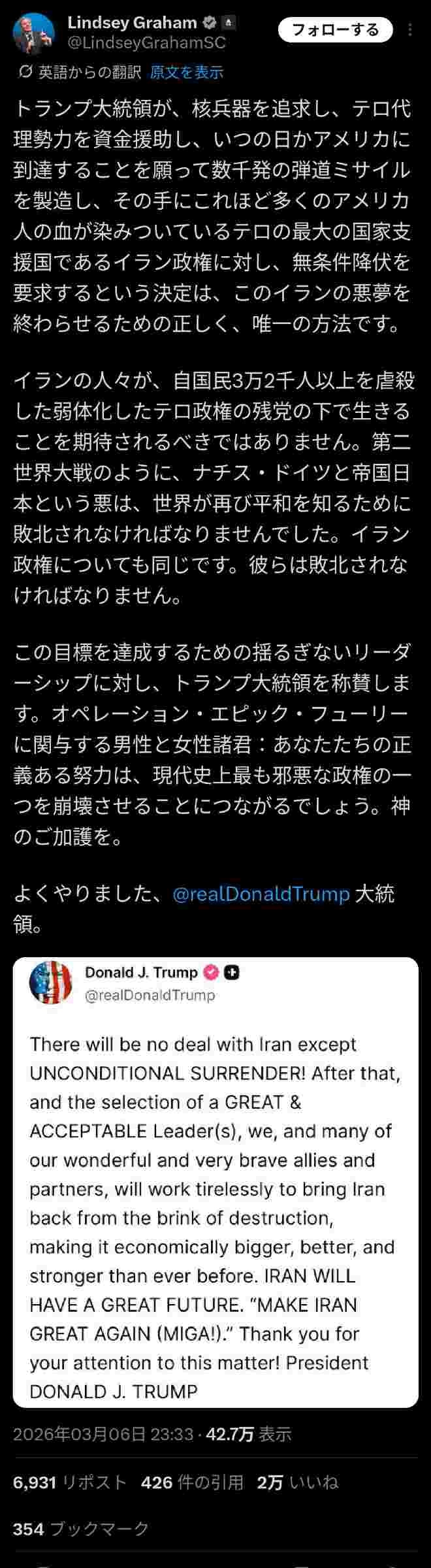 彼らは打ち破らなければなりません。この目標を達成するために揺るぎないリーダーシップを発揮したトランプ大統領に拍手を送ります。「エピック・フューリー作戦」に携わるすべての人々へ。あなた方の正義の努力は、現代で最も邪悪な政権の一つを崩壊させるでしょう。ご多幸をお祈りいたします。大統領、よくやった。