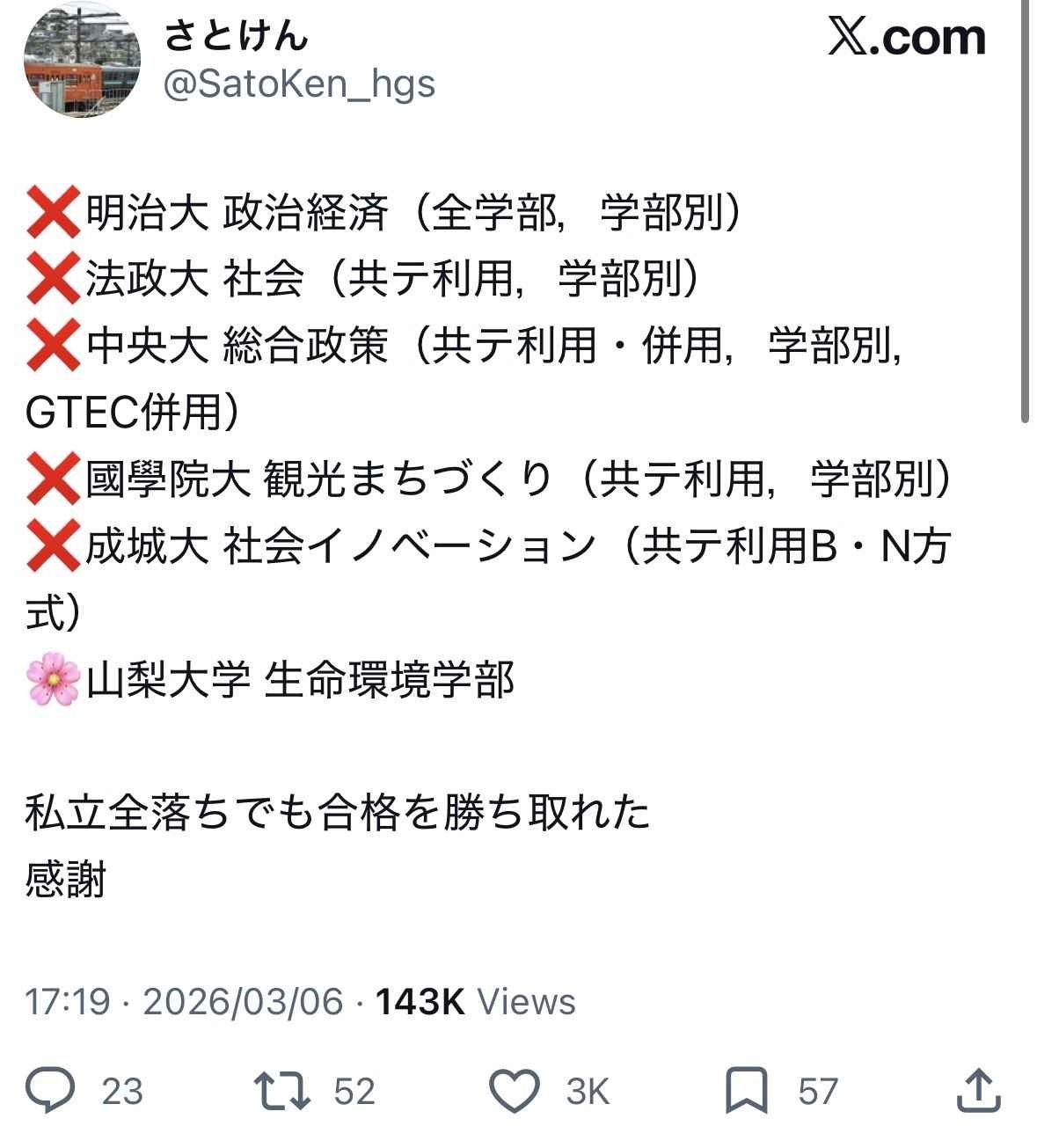 地元の国立は余裕やったけど明学落ちたの思い出した