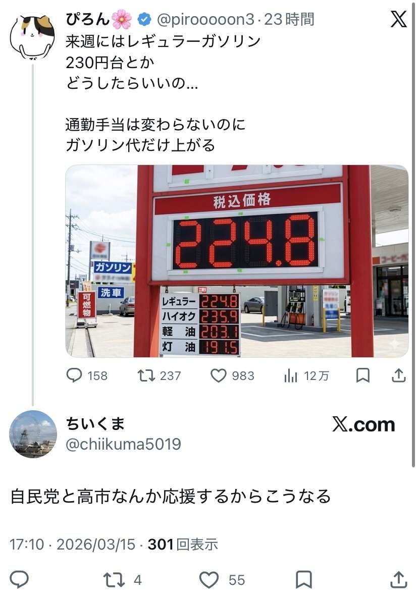 ガソリン代爆上げはふわっとノリで高市支持してた層が離れてくだろうね
