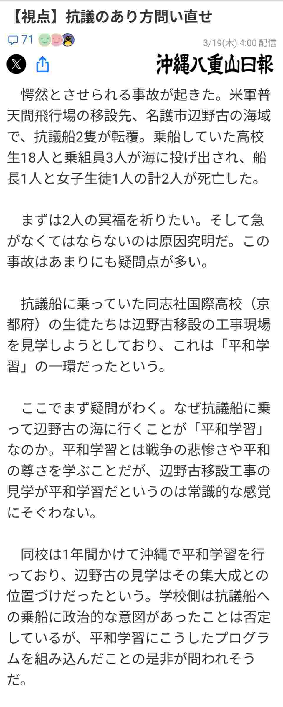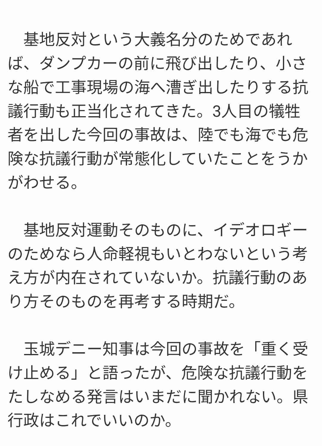左翼の低調ぶりが極まったような惨事だな。運動自体は否定しないけど、意味のある活動かと言うのは見直したほうがいいのではないかな。警備員、高校生、船長と3人も犠牲にしなければいけなかったのか。工事は全然止まる気配がない。